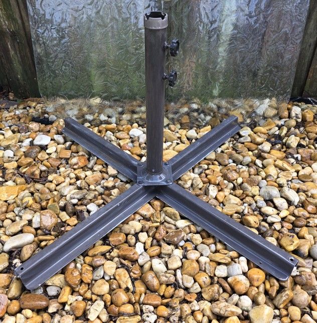 HEAVY DUTY LARGE CAPACITY UMBRELLA STAND. 40"W x 22"H can be screwed down or put 4 square concrete stepping stones in the slots, as shown in 4th picture, and stays put.