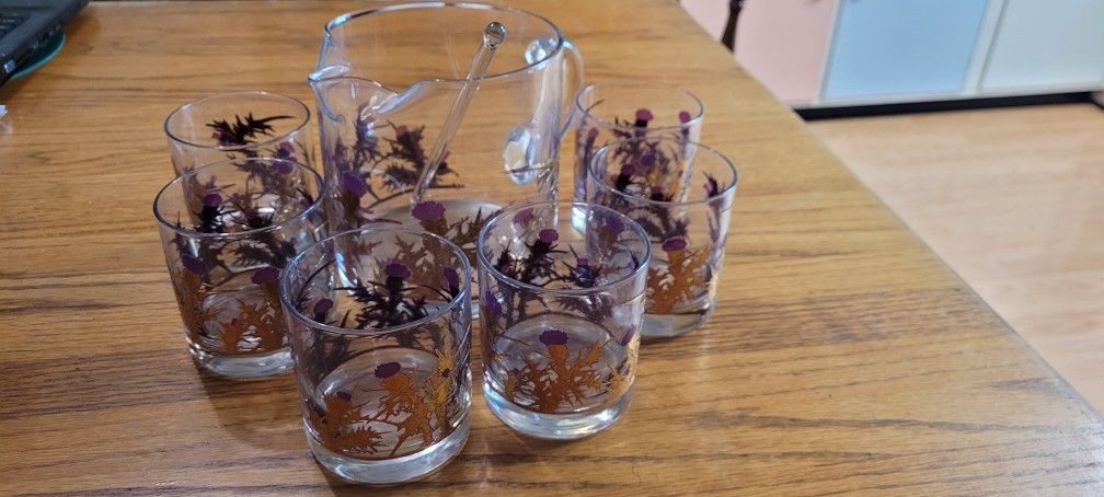Purple thistle flowers with 22k gold detsil. Scottish thistle signed Vintage Barware. Includes glass pitcher ,6 small rock glasses, and one stirrer