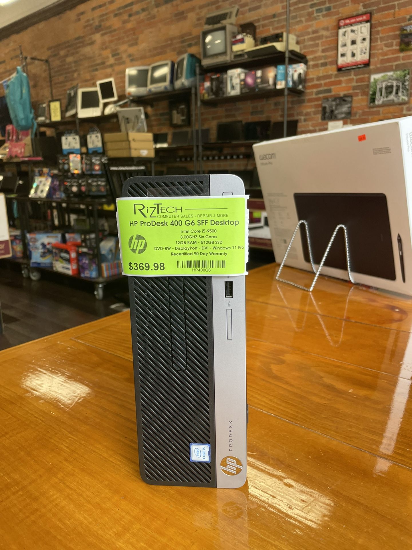 HP ProDesk 400 G6 SFF Desktop Intel Core i5-9500 3.00GHz Six Core 12GB RAM 512GB SSD DVD-RW DisplayPort DVI Windows 11 Pro $369.98 SHIPPING NOT AVAILABLE, Curbside or in store pick up available Financing available. Text 31005 to 22642 to apply. INCLUDES: - Professionally Recertified computer with 90 Day Warranty on parts and labor unless otherwise noted, some nearly new computers will have the balance of the Manufacturer’s Warranty and will be noted; new and open box have Manufacturers Warranty - Original manufacturers power cord, no third party parts - FREE carrying case with any laptop purchase - FREE: We will transfer your files and photos from your old computer to any computer you buy at RizTech Available for pick up at our small local business RizTech in Medina, our shelves are FULL and we have hundreds of computers available plus tablets, iPads, iPhones, and a store full of top tech. If you haven’t heard of RizTech before, Google us. Our mission is to help our community save on tech and expect more. PLEASE READ 👇 Pick up only, we do not ship We are a small mom and pop shop, Google us! Hundreds of computers and a store full of new tech on shelves every day Monday - Friday 10-6 Saturday 11-4 Let me know if you want more pictures. Thanks. Call with questions. (contact info removed) 215 S. Court Street Medina Ohio