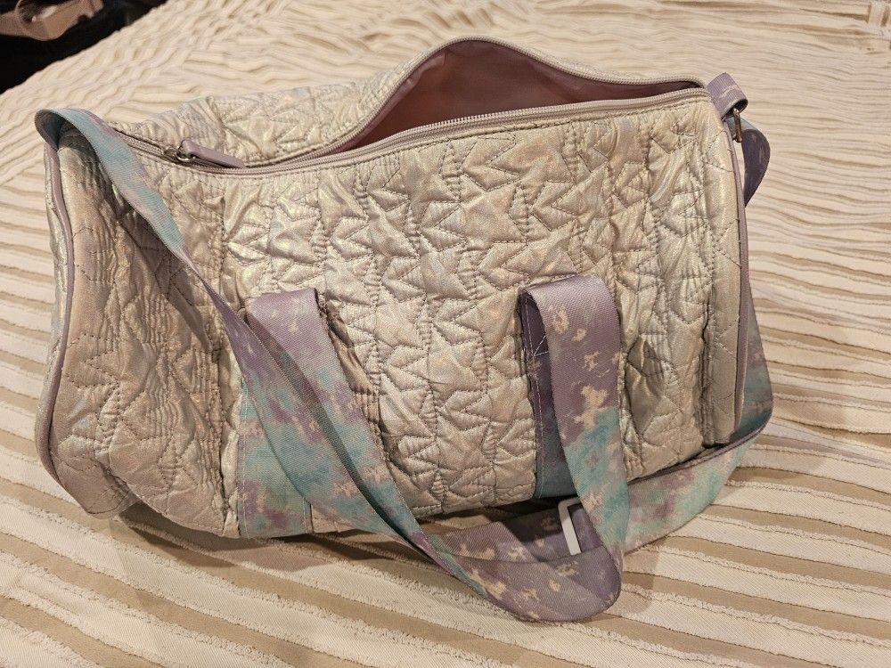 Silver dance bag, smoke free home. Star pattern in silver material. Two hand straps, one shoulder strap.