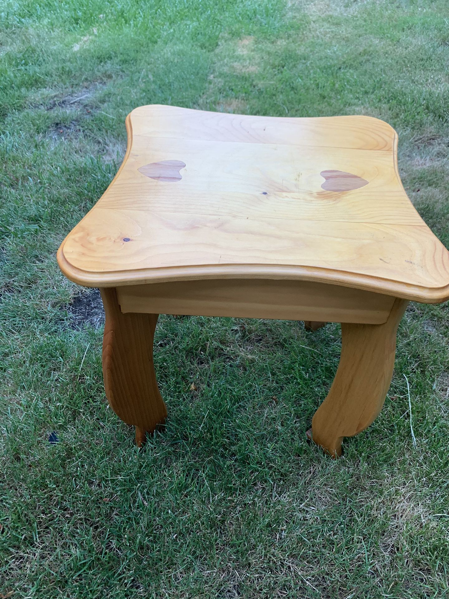 Wood end table oak heart inlays. Handmade.16” square top and 17” high. nice for college dorm. Just $10 or best offer.