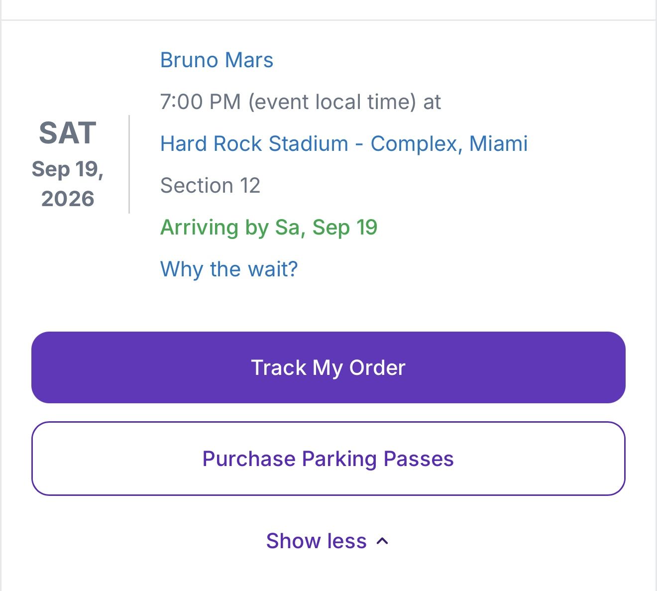 Got 2 tickets for Bruno Mars, it’s on Sep 19 at the HardRock in Miami Florida. Floor seats in section 12
