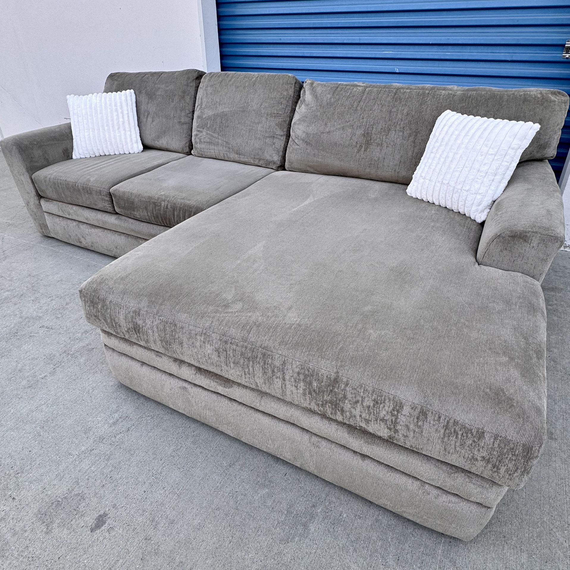 $50 local delivery (includes help carrying into your home if needed) Can also take your old couch to get recycled for a fee, check out our other listings) Location: Garden Grove (92840) Description: Size: 116in x 72in Height: 31in Depth: 25in Chaise width: 54in Large light gray Living Spaces right-hand facing sectional with a huge chaise & extra deep, very plush & comfortable seating. Retails brand new for $1,500. All covers can be removed & machine washed. Only 3 years old. Perfect for a single person, roommates, couples or a family. Accent pillows not included. Condition: In like new condition. Clean, smoke & pet free. Has been vacuumed & sanitized. Preferred payment method: Cash with a deposit on Venmo.