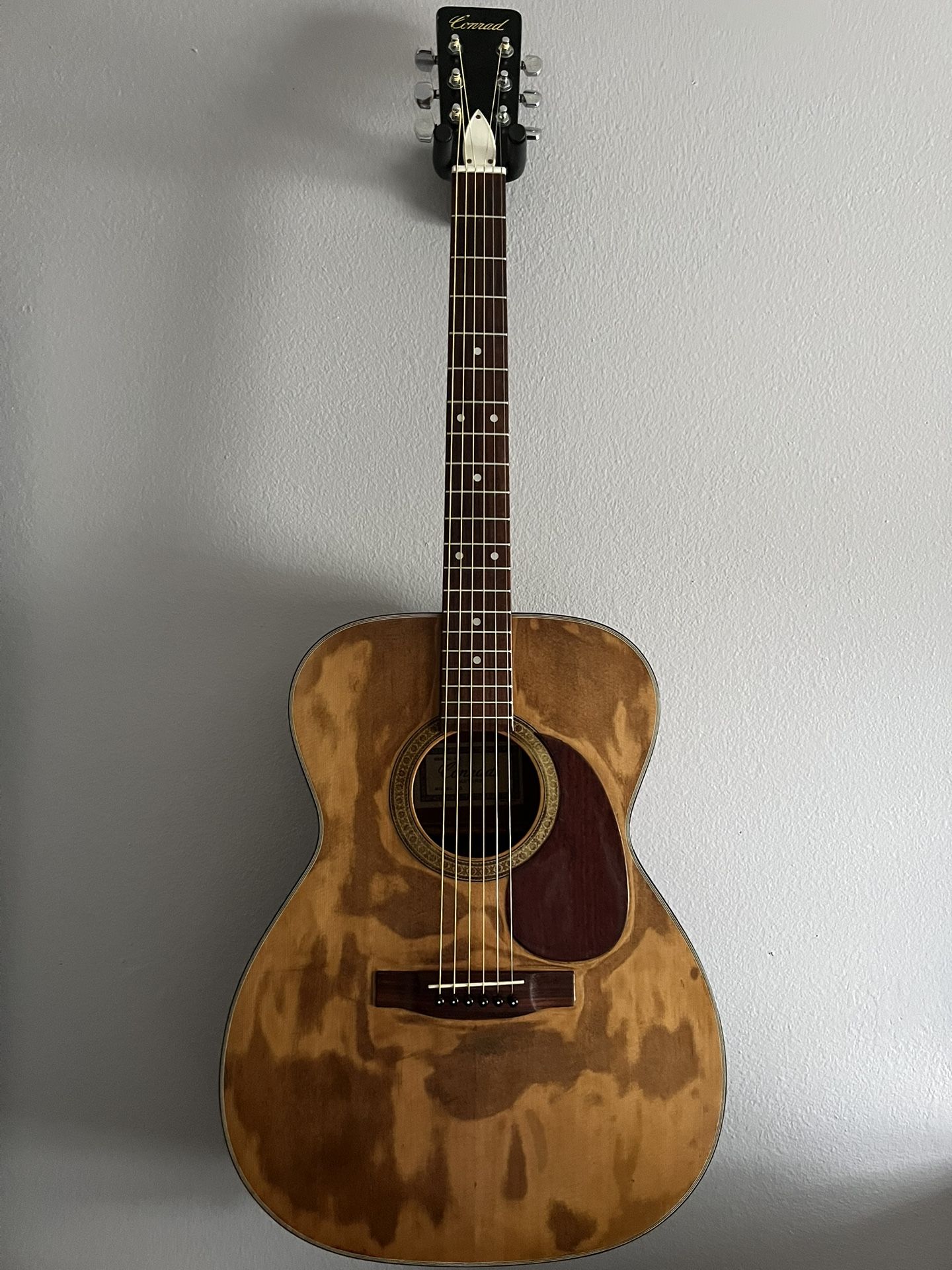 Conrad 40217 concert acoustic guitar. Lawsuit era, 1970s, made in Japan. Neck is straight and it plays super well. No major damage, but lots of wear as seen from use. Great sounding and playing vintage acoustic. Local pickup in Ocoee, FL.