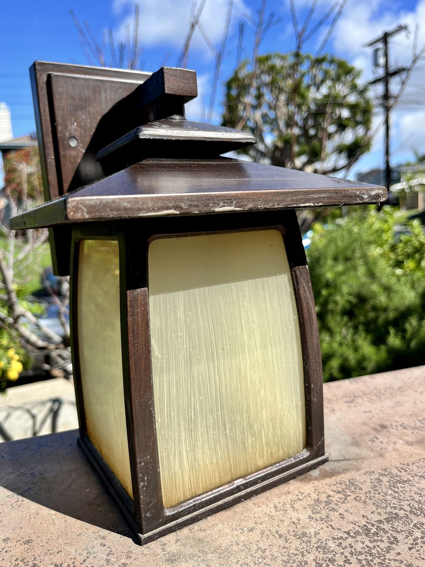 Four 12” wall-mount outdoor light sconces. - Rubbed bronze finish. - Arts and Crafts motif. - LED luminaires. - Some finish bubbled and chipped. - Discontinued line.