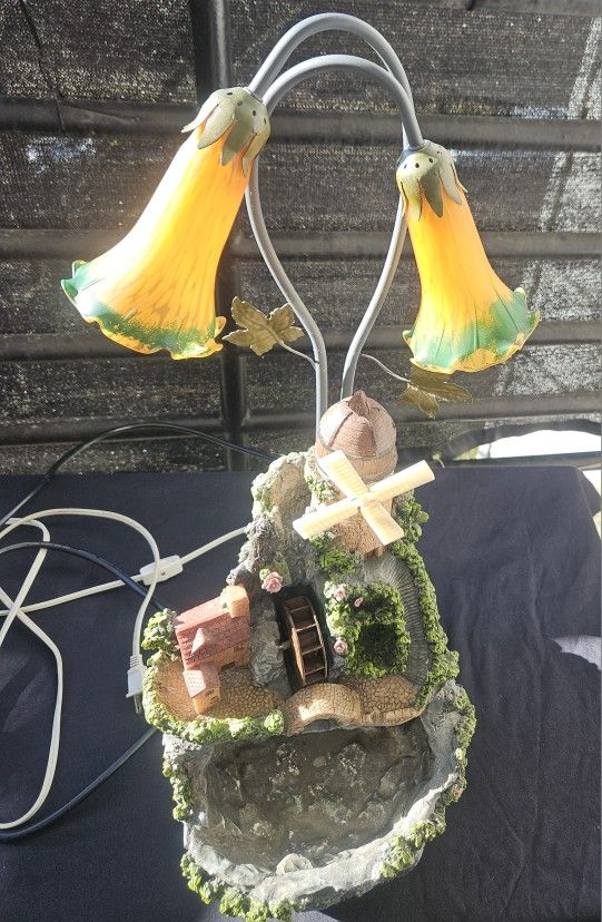 Vintage Indoor Water Fountain AND Tiffany Style Lily Lamp. Very Rare. Find another if you can. Works perfectly. Water pump works and lamp works. Waterw wheel mill and windmill both spin as well. Used. The only thing I can see is some fading to the green on the lamp shades, but no other flaws. In great condition. Very heavy. In the 2nd Pic you can see everything is moving by the blur as well as the lamp works.