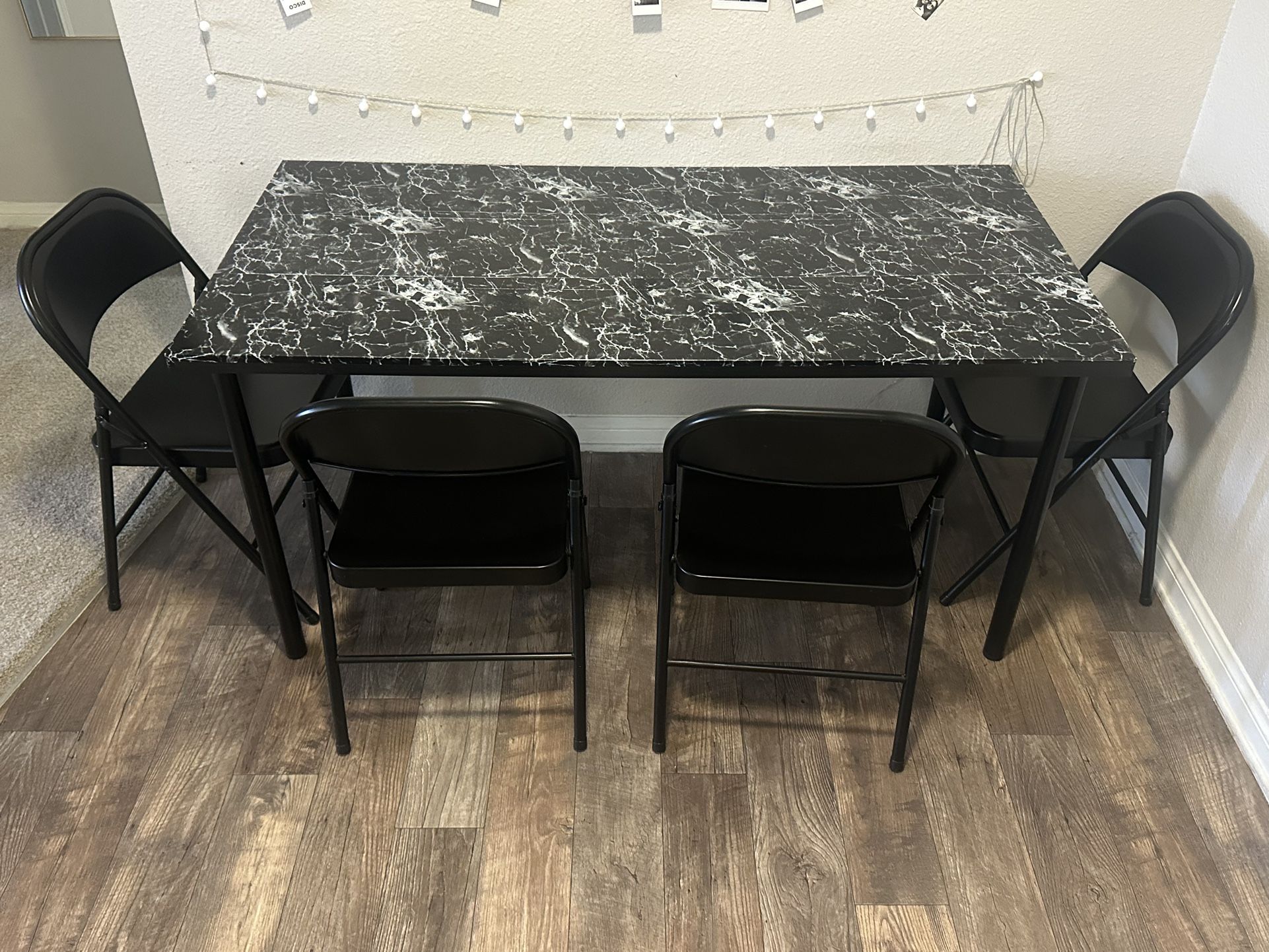 Table and 4 basic black chairs. The tabletop is covered with decorative adhesive paper. Selling as a set for $30, or separately: $15 table, $15 for all 4 chairs. Pickup only.