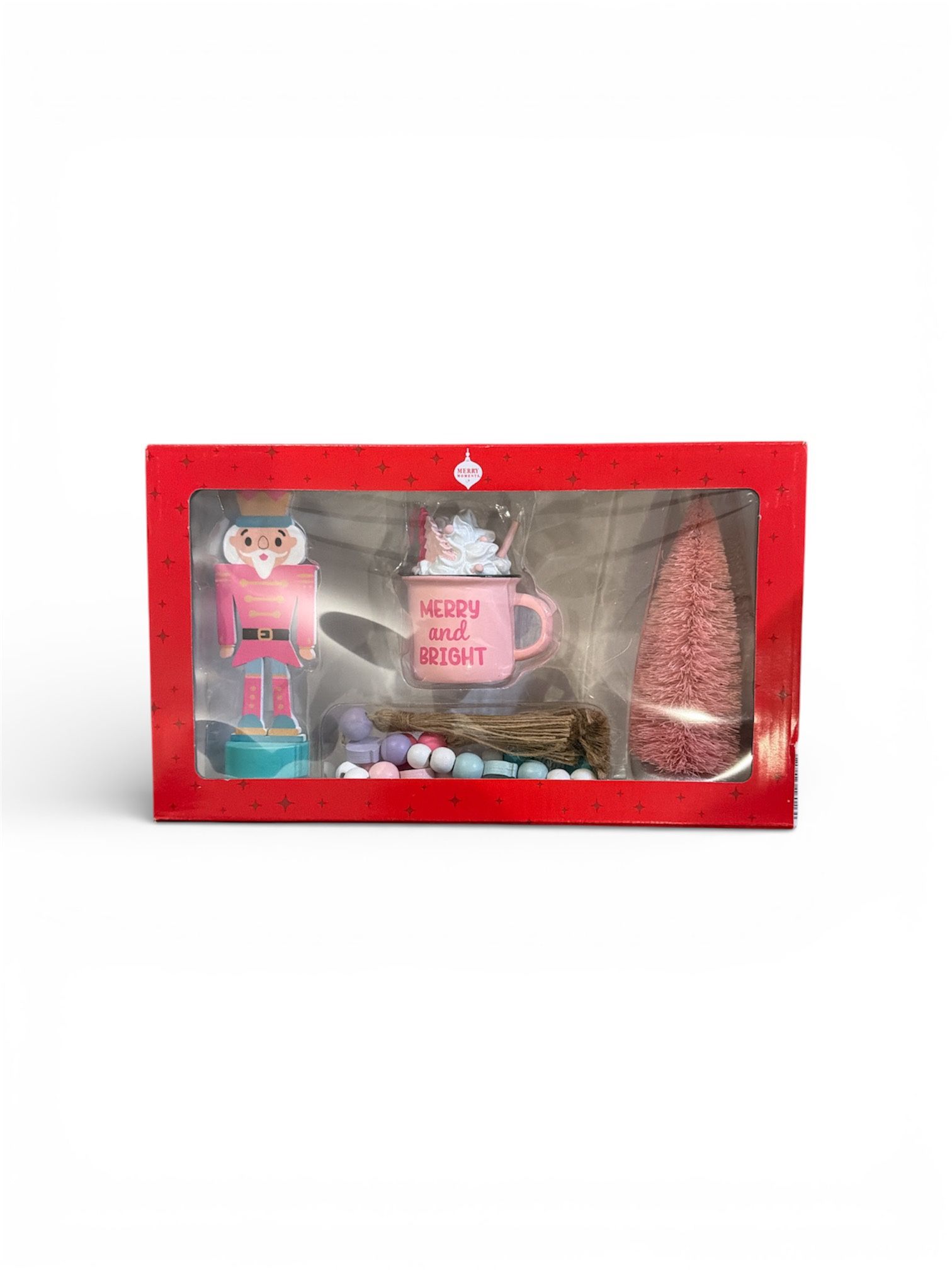 Brighten your holiday with this festive decor set. Includes a pink mug with 'Merry and Bright' text, a pink tree, Pink Nutcracker and colorful beed ornaments.