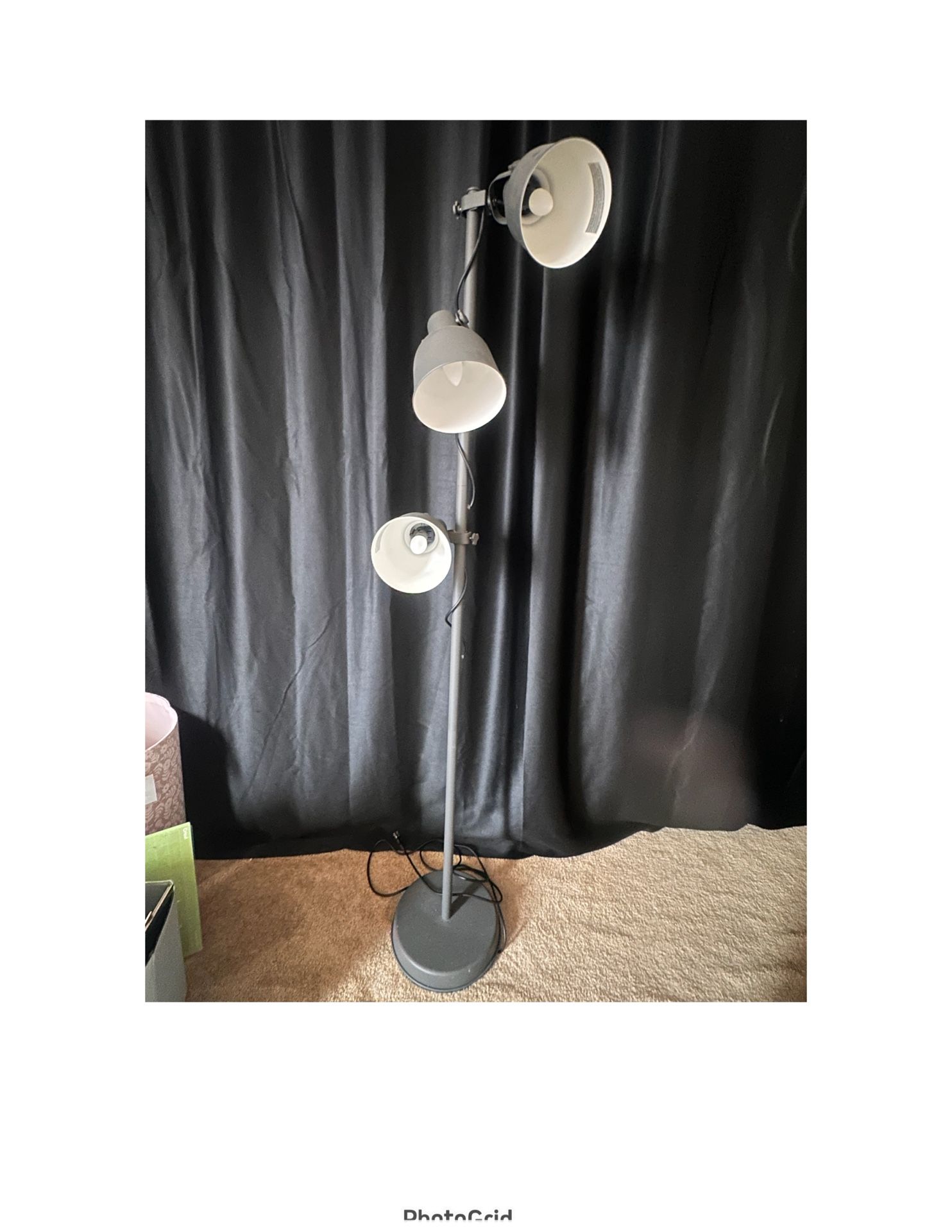 IKEA Floor Lamp Color: Dark grey Like new Light bulbs work great Height is adjustable You can switch each light head on or off individually Max.: 8.6 W Height: 69 " Base diameter: 12 " Shade diameter: 6 " Cord length: 110 1/4 " Must come pick up