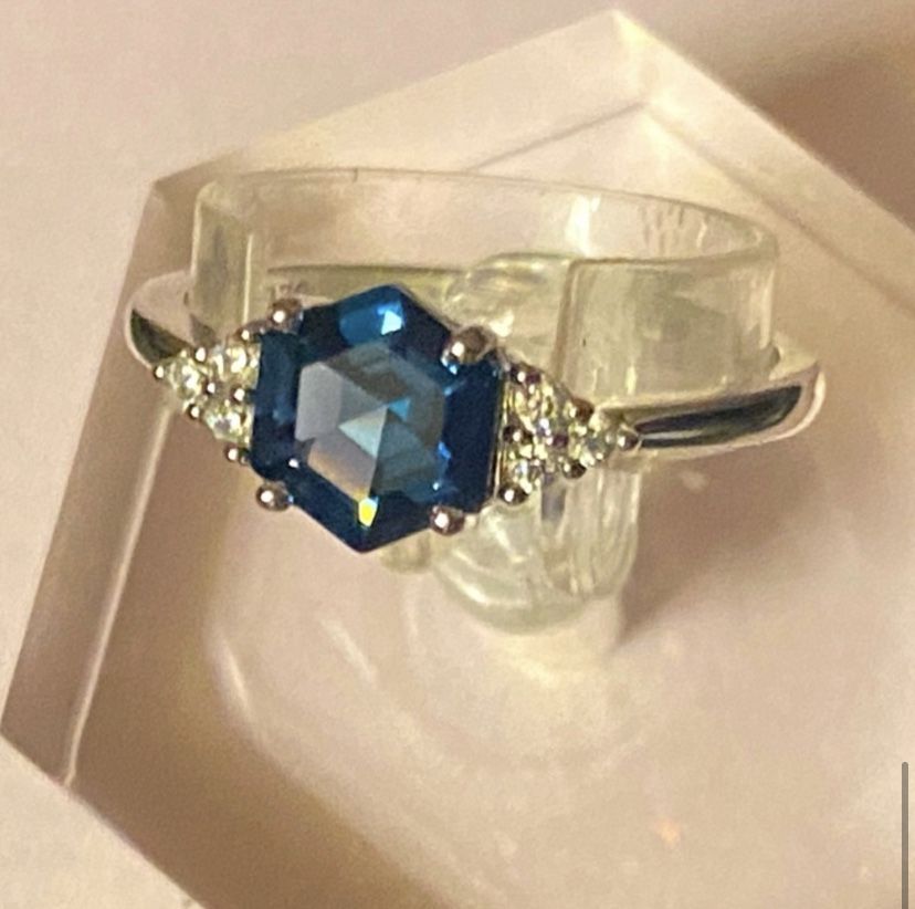 NEW! 2ct Hexagon Cut London Blue Topaz with MicroPave White Topaz Accents in a White Gold plated Solid Sterling Silver Ring, stamped S925 is exquisite! Handmade Fine Jewelry Sz 6
