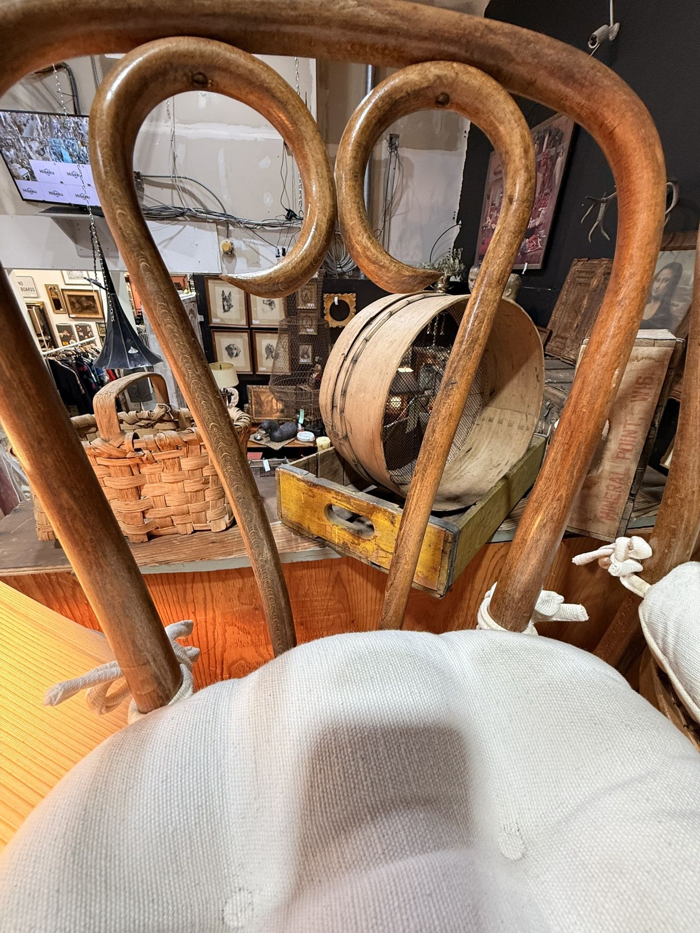 There are 3 total available $125 each $99 for the 3rd (slightly worn seat) $289 for all 3! These beautiful bent wood chairs have been recently re-oiled and sealed. They have rattan seats and cream colored cushions included. The rattan seats of two of the chairs are in excellent condition. With the 3rd chair - the rattan is slightly dipped from use. With the cushion, however it is still in very good condition and completely usable. Asking $125 for each chair except the 3rd $99 (with the slightly curved seat). Dimensions 16” round-ish seat 16” tall at seat 19” with cushion (included) 36” tall at back