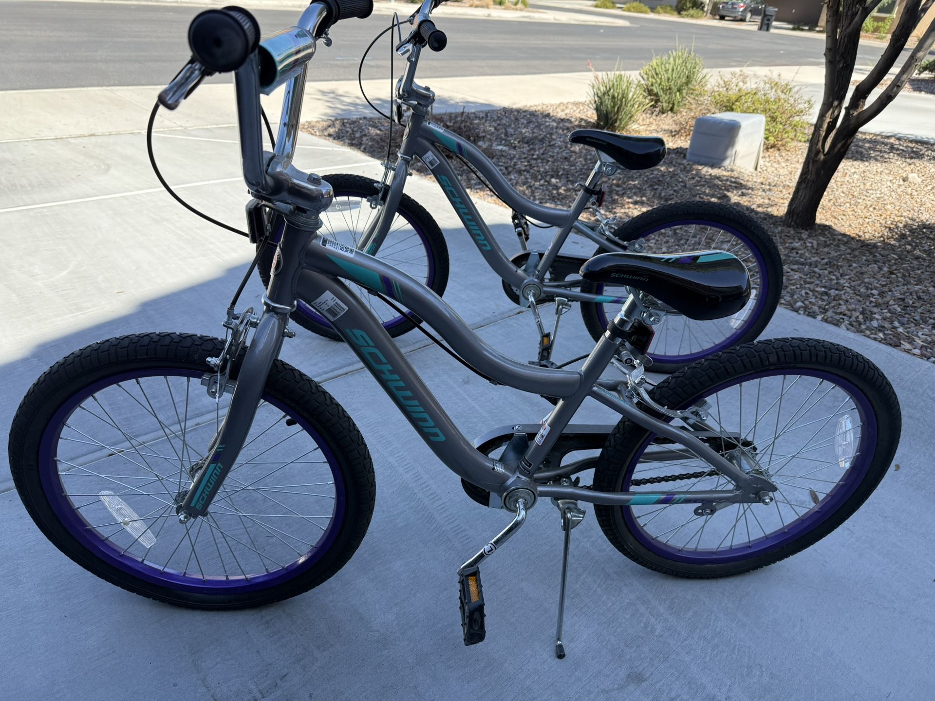 2 girls 20” Schwinn Astrid bikes. In almost new condition. Our daughters only rode them a handful of times but quickly grew out of them. Would like to sell together but will sell separately. Asking $180 for both or $95 each The tires need air but other than that, nothing wrong with them at all. Last picture shows how much they are ‘new’ at Target.