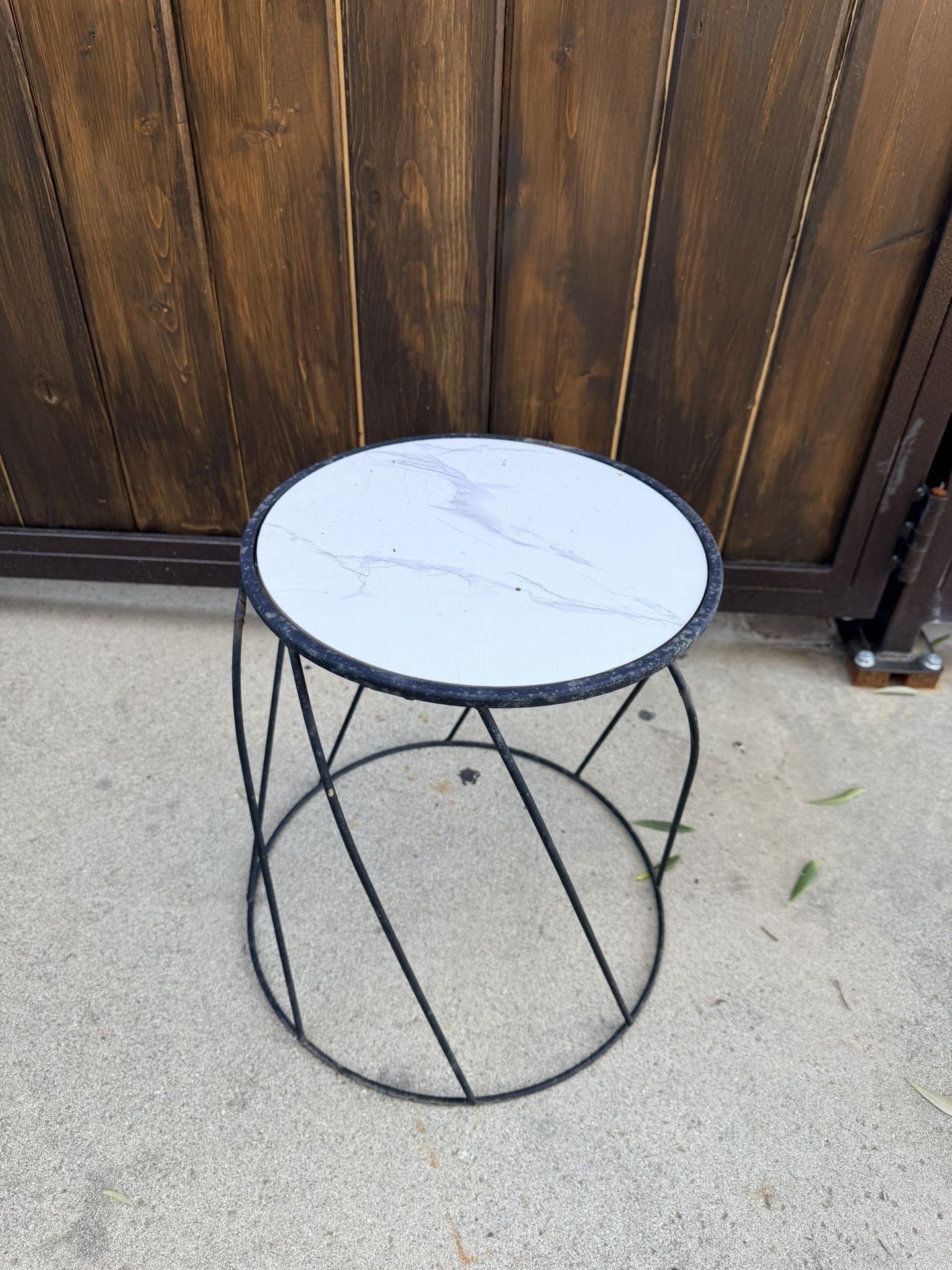 Cute marble top, and metal, used it as a side table with my outdoor chairs or could be used as a plant stand, measurements in pictures, pick up in Rowland Heights