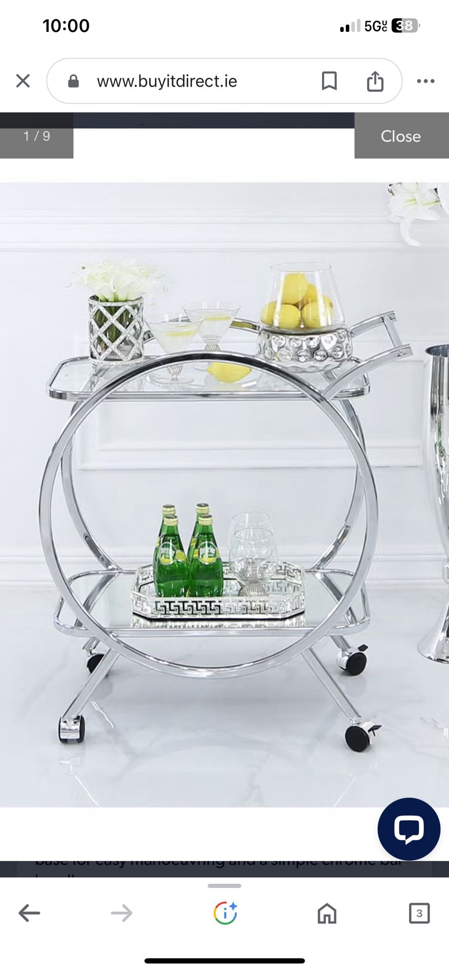 Dimensions: H81.5 x W71 x D36.5 cm Product Information Simple and stylish, this glass drinks trolley is a great way to keep drinks and glasses handy when entertaining. Featuring a circular design in chrome with rectangular glass shelves. Wheels at the base for easy manoeuvring and a simple chrome bar handle. Features: * Perfect for entertaining * 2 shelves provide ample space for keeping glasses and other drinkware handy * A true statement piece * Finished in clear glass & shiny chrome * On wheels for ease of manoeuvre