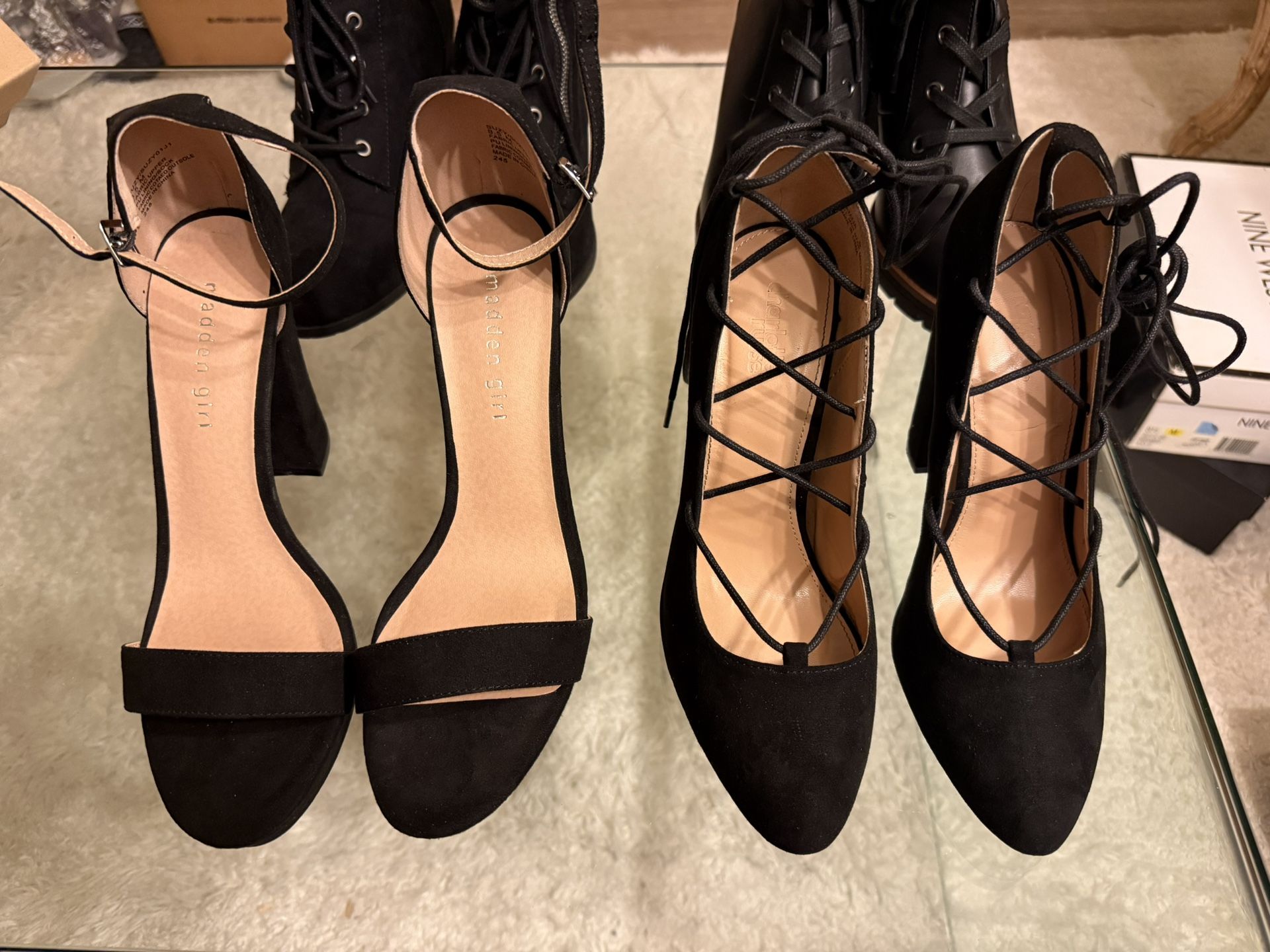 (SEMI NEW) Black Heels Sandal Size 9/ Lace up Size 9. Worn for about an hour for both. They’re almost brand new! Asking for $10 for each. Cute for a night out! Message me if interested! (SEMI NUEVOS) Tacón sandalias talla 9/ Botines con abujeta talla 9. ¡Usados como por una hora, están práctica nuevos! Pido $10 por cada una. Bonitos para un baile! Mándame mensaje si te interesa! Hablo en español