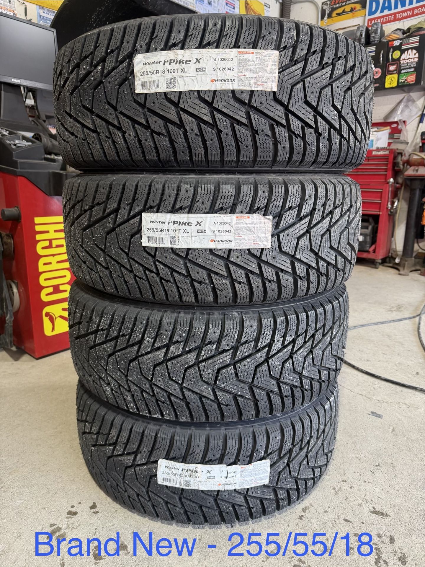 (4) - 255/55/18 Hankook Winter iPike X Snow Tires Cards accepted with 2.8% merchant fee Condition - Brand new, never mounted. Installation is $25 per tire plus tax. $5.00 per tire to recycle the old tires Lifetime flat repairs included WITH the purchase of mounting and balancing. Does not apply for cash and carry sales Price is FIRM, NOT accepting offers. Not interested in trades. Other sizes and brands available, let me know if you’d like a quote. Thanks for looking.