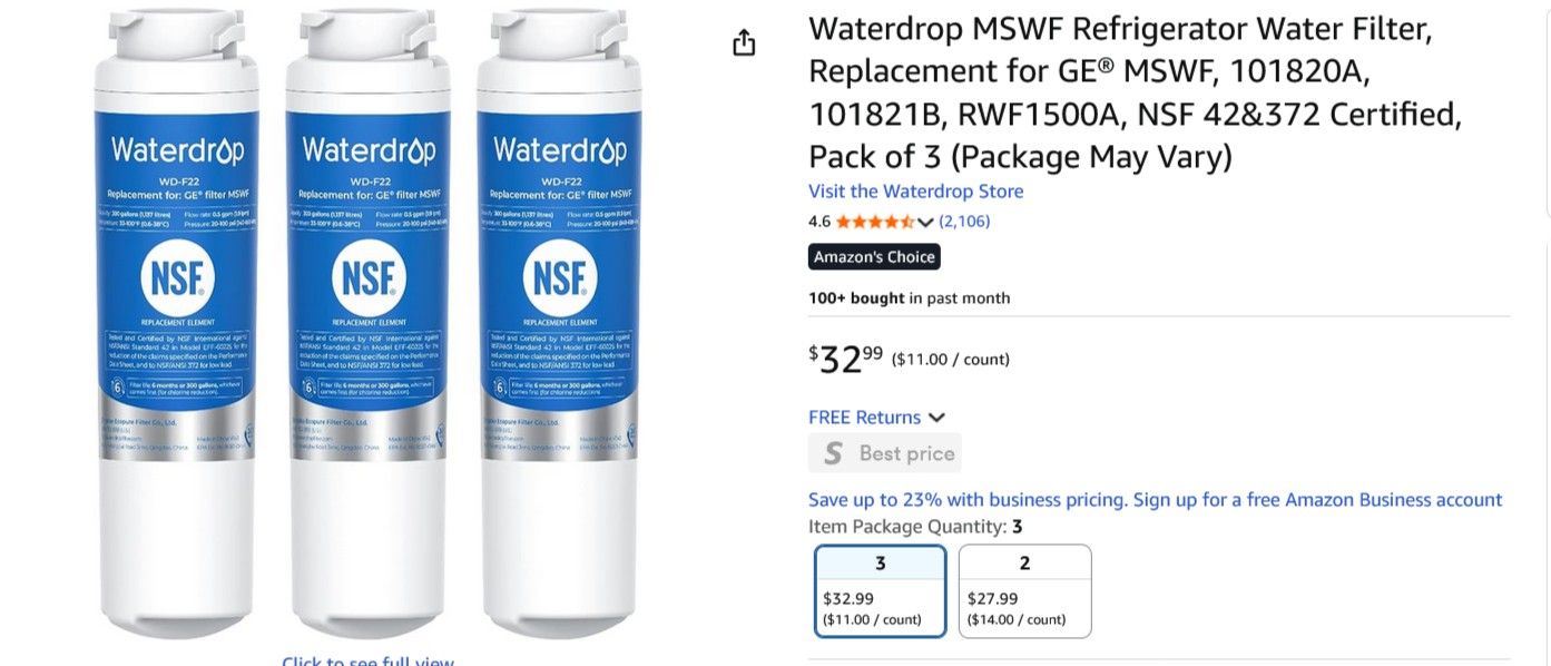 Waterdrop MSWF Refrigerator water filter for GE 101820A, 101812B, RWF1500A, NSF42&372