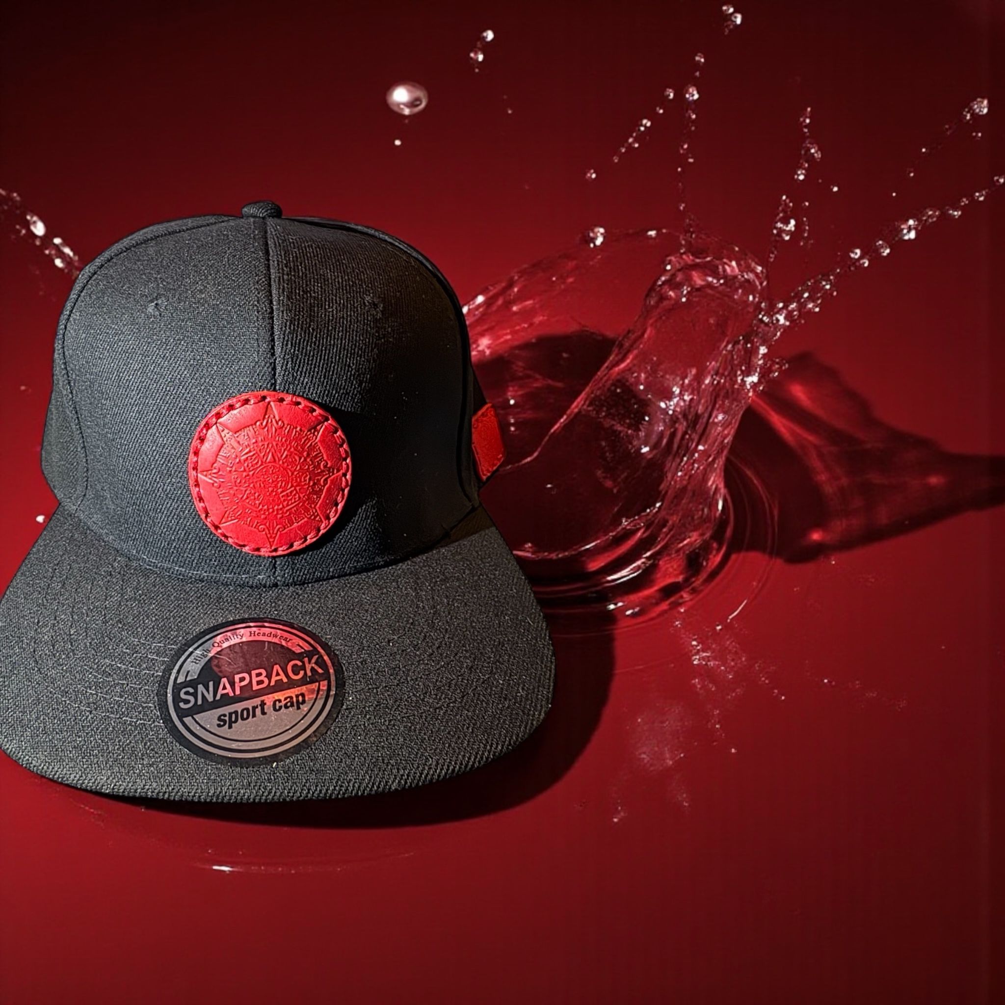 Snapback hat with a Aztec Calendar logo hand sold into the hat with authentic leather with authentic leather rose on the side of the hat
