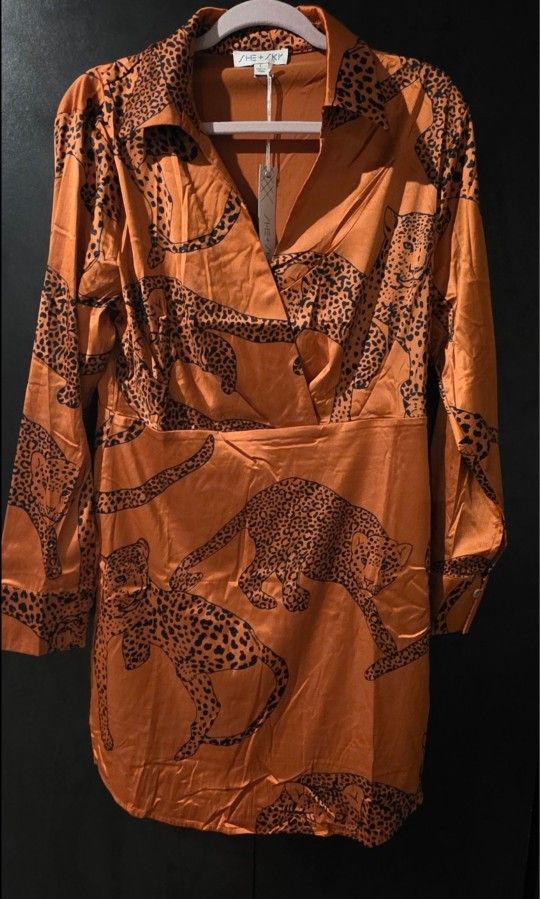 Rust tiger satin Dress Side zipper Stretch in waist Buttoned cuffs Snap in chest