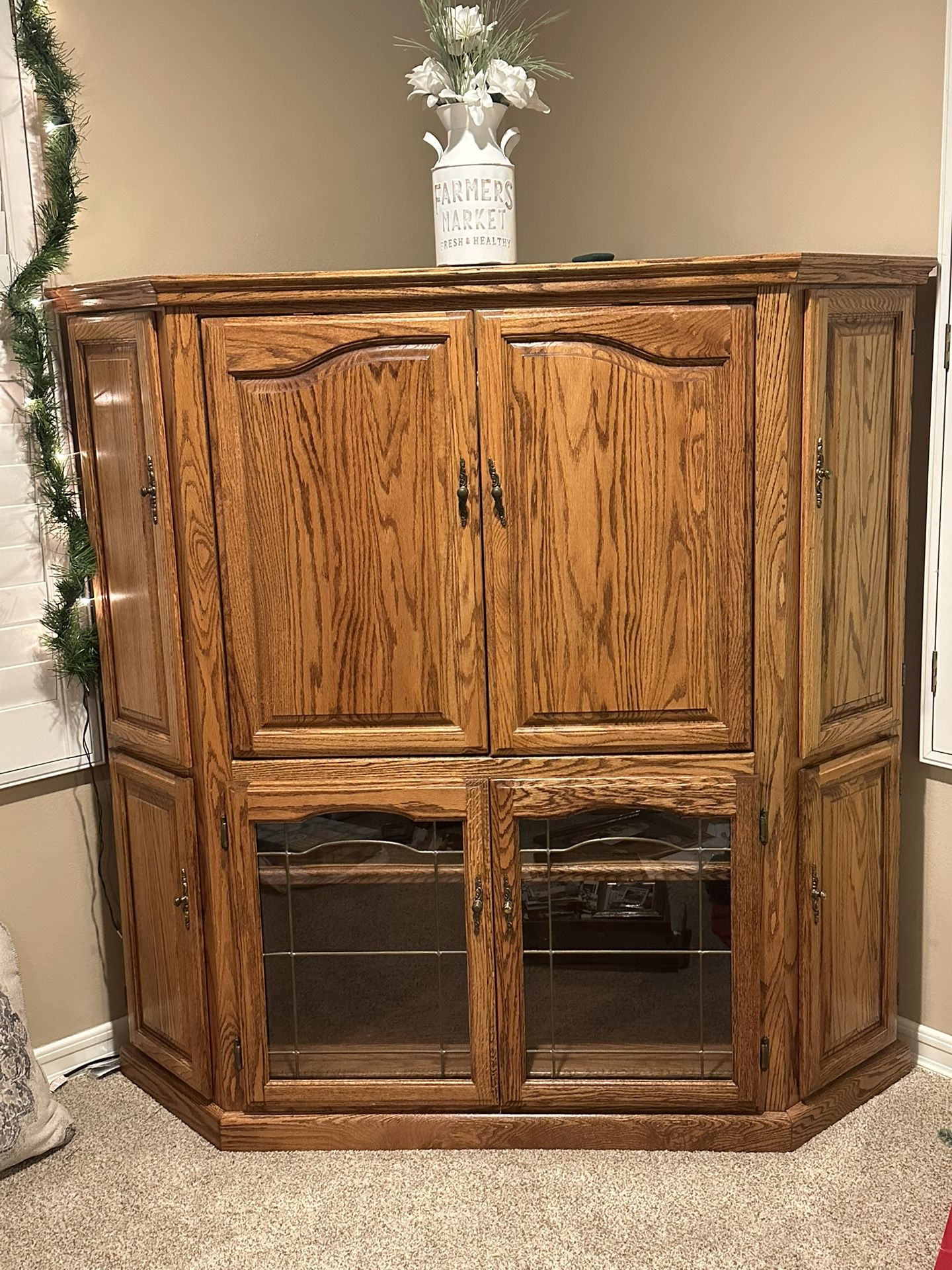 Well kept solid oak wood entertainment center. All doors work. No scratches. Very well maintained.