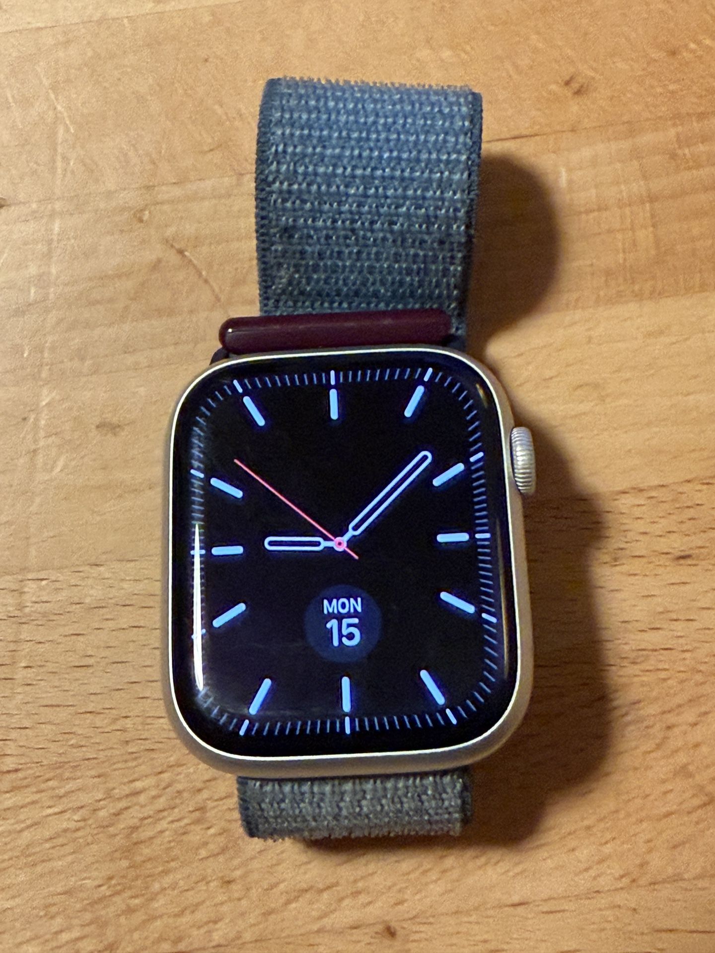 For sale: Apple Watch Series 9. Silver, 45 mm, with Winter Blue Sport Loop. WiFi version (not cellular). Comes with charger (of course) and original box. Perfect condition. Battery health: 92%. Factory-reset and ready to go. Selling because I bought an Apple Watch Ultra. Asking price: $160 OBO. Cash only. Thanks! --Ron