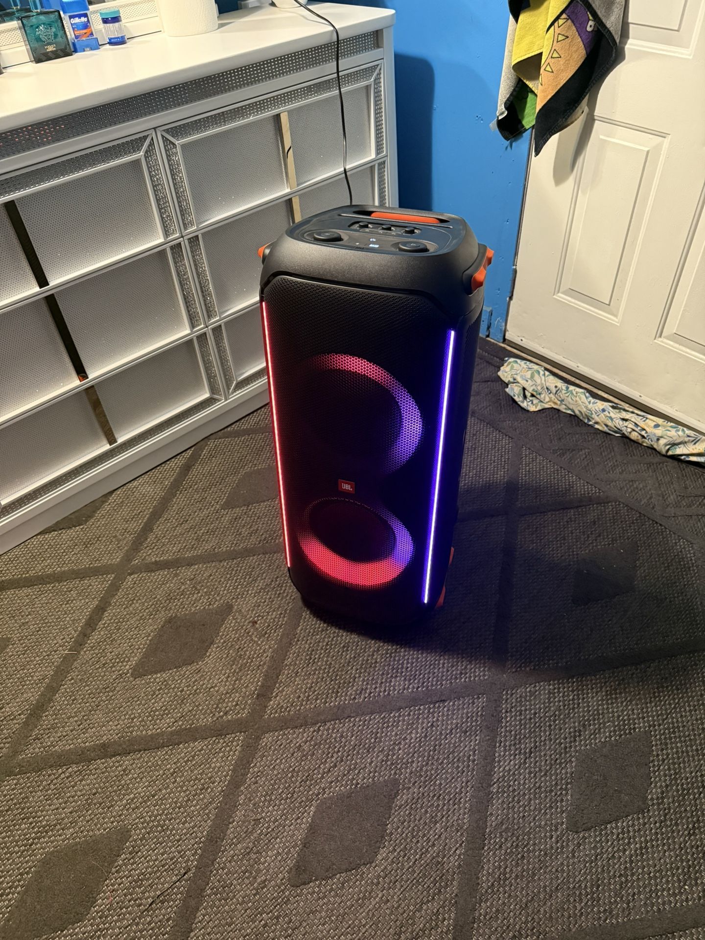 I bought it thinking I was going to use it ended up using it only twice now I’m stuck with this big speaker and trying to get some money back. Black JBL party speaker with orange accents, has a handle on top, control buttons, and LED lights on the front. It's a portable speaker with a rugged design and is in good condition.(no box)