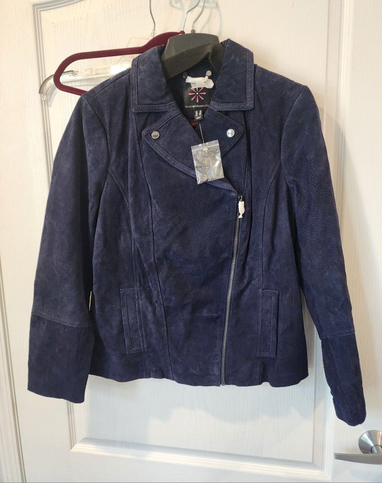 NEW Isaac Mizrahi Live BLUE Suede Leather Moto Biker Jacket Floral Lining SIZE L