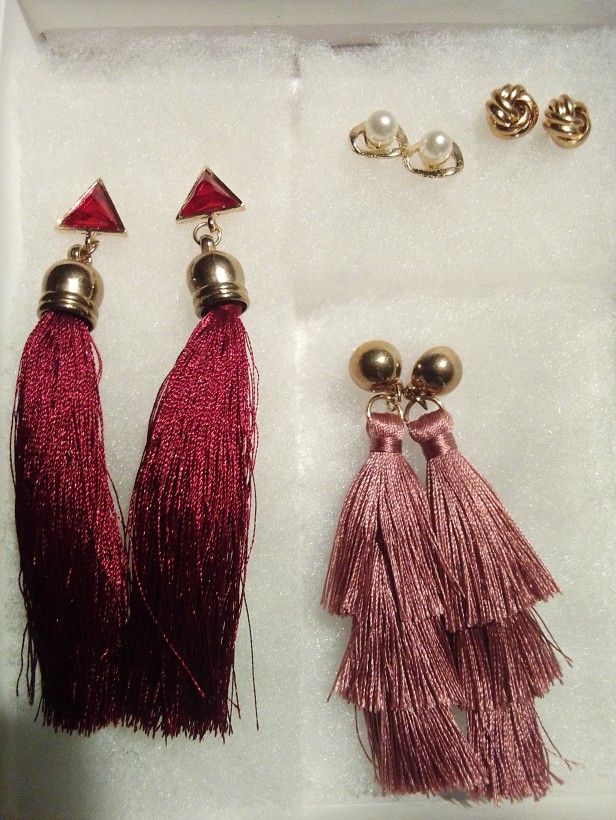 Happy Holidays! It's Snowing Gold ..This is a set of 10 Luxury pairs of Brand New, Never Worn Pairs of Earrings. Taken Out of Plastic Packaging & Placed in an Ivory White Gift Box. Includes: (1) Pearl Gemstones (1) Pearl Gemstones w/Gold Stroke (1) Gold Bars (1) Royal Red w/ Ruby Rope Tassels (1) Mauve Stacked Rope Tassels (1) Gold Pretzels (1) Gold Crescent Moon & Pyramid (1) Gold Diamond Hoops (1) Gold Flats (1) Gold Domes Very Beautiful Set of Accessories That Go With Any Outfit, For Any Event. Check my other listings for more😎