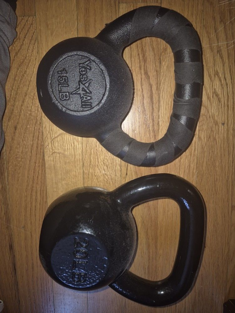 Have for sale 2 kettlebells, 15 LBs and 20 LBs. Great condition. Price is $15/OBO for 15 lbs, $20/ OBO for 20 lbs. And $30/OBO for both. Picked up in Wrigleyville.
