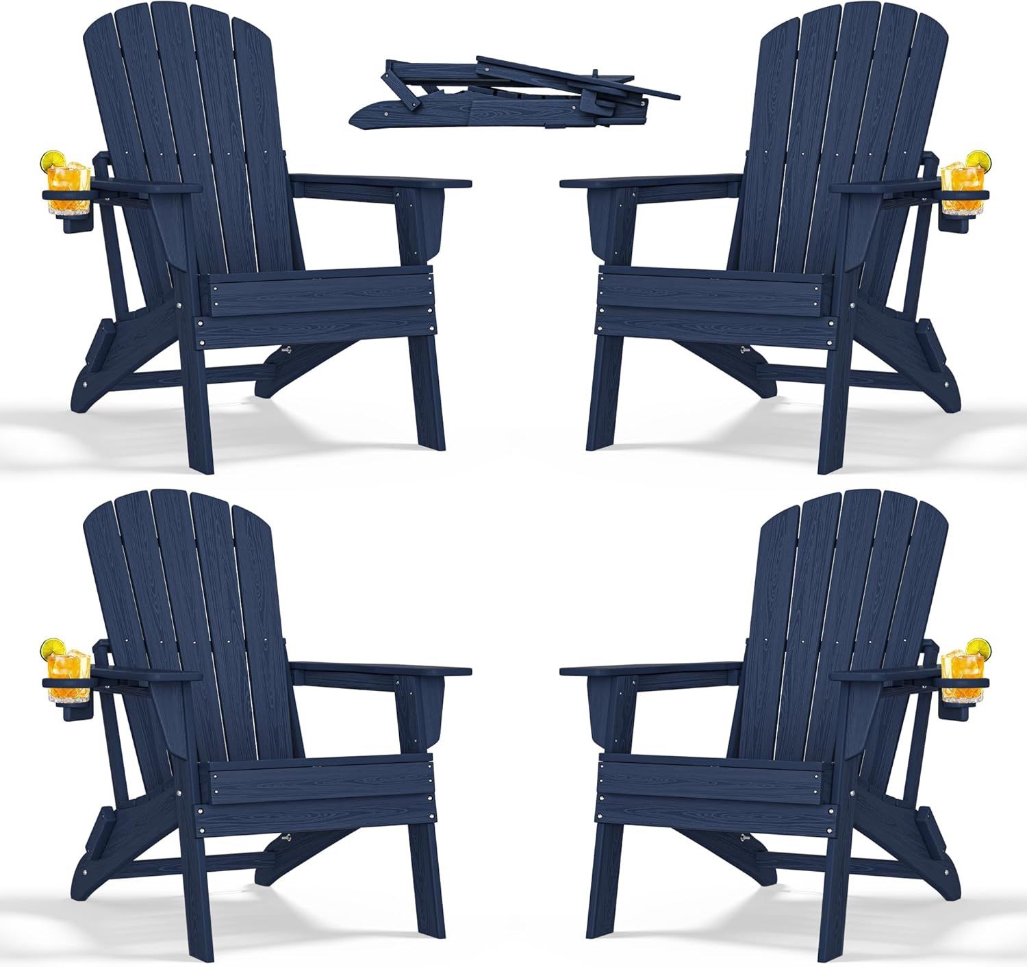 Folding Adirondack Chair with Cup Holder Set of 4, HDPE Patio Chairs,All-Weather Outdoor Chairs for Backyard, Deck,Fire Pit-NavyBlue