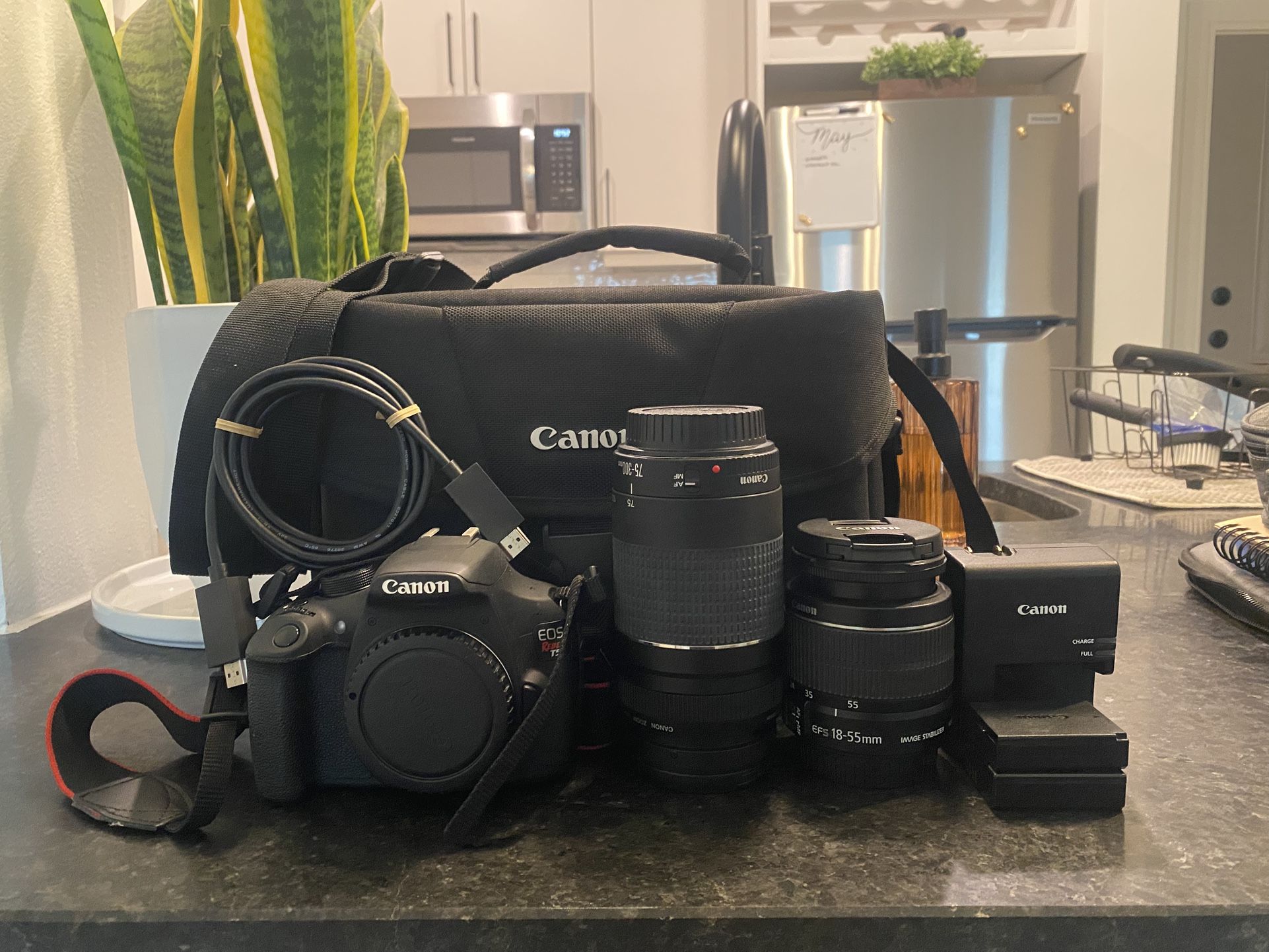 - Canon EOS Rebel T5 - 18-55mm Lens - 75-300mm Lens - (2) Batteries - Battery Charger - Canon Camera Bag - Canon Camera Strap - HDMI Cord - 16 GB SD Card