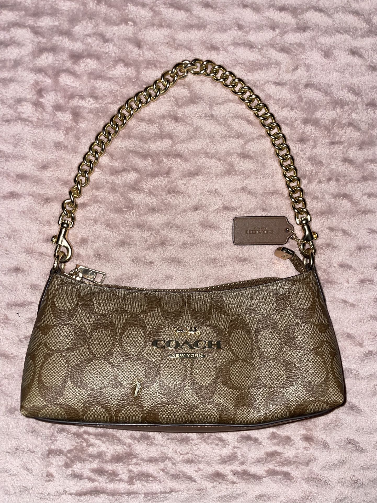 100% Authentic Used Coach Charlotte Shoulder Bag in signature canvas with gold strap. Some damage as seen so accepting low offers!