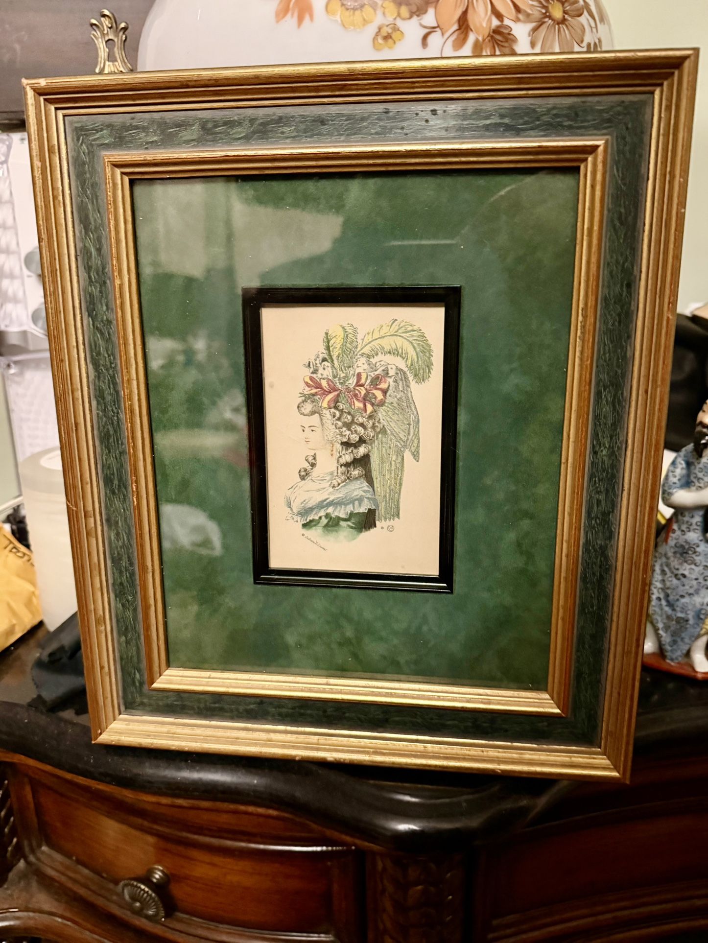 18th-century French fashion plate from the influential series Galerie des Modes et Costumes Français (1778–1787). The illustration depicts a woman wearing a highly elaborate hairstyle known as a pouf, which was popular during the reign of Louis XVI and Marie Antoinette. Fashion Details Hairstyle (Le Pouf): The towering, voluminous hairstyle was a canvas for personal expression in the late 1700s. It was typically created using a combination of the wearer's own hair, false hair, pads, and wire frames, then finished with pomade and powder. Adornments: The style in the image is heavily decorated with a large red and yellow bow, and tall feathers, which were expensive and significant indicators of wealth and social standing. Feathered headdresses were particularly popular, with ostrich plumes being among the most desired. Historical Context: Fashion plates like these were considered accurate representations of the styles seen in Paris and were often drawn from life ("d'après nature") by celebrated artists of the era.