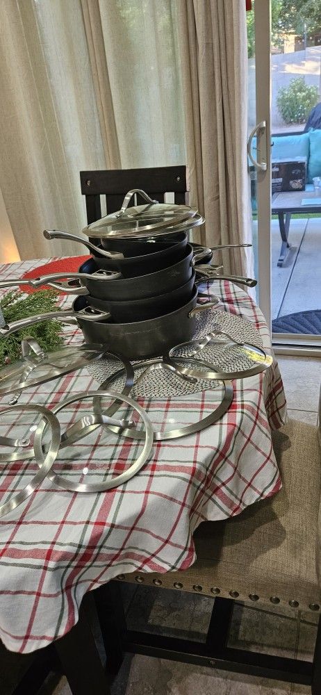 Calphalon full set of pots, pans, and lids Also including stock pot with 3 different types of inserts, this is 2 sets combined $100 for all of it Smoke free and pet free home Always hand washed even though they're dishwasher safe Have never used metal on the them Non-stick with no peeling High quality set with so many amazing features - compatible with all types of stove tops, tempered glass lids, oven safe up to 450°, very easy to clean, mineral shield nonstick technology Selling because we are switching our cooking method Located near Signal Butte and Ray or pick up Gilbert and Pecos when my husband's at work