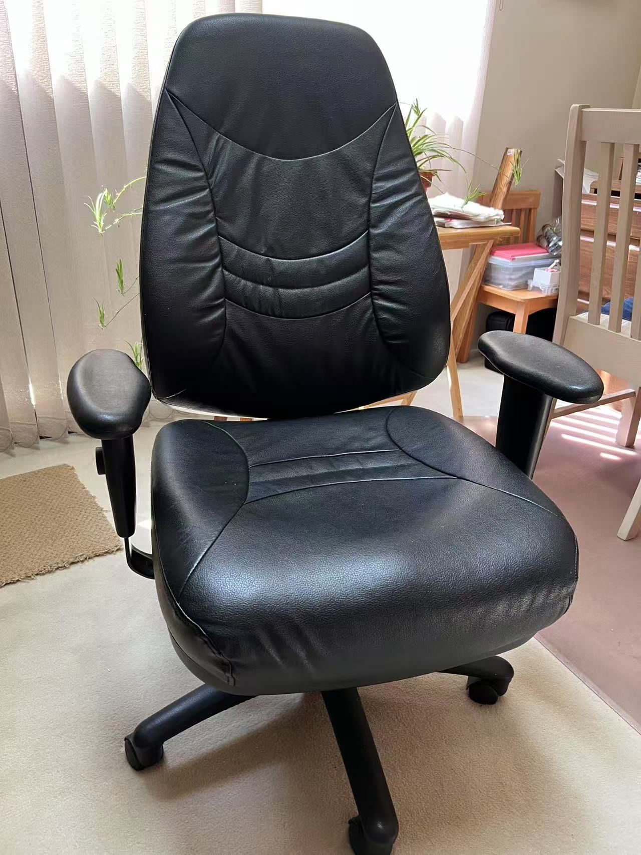 Size: H 43” W 21” adjustable Color: Black The high-back leather seat is in excellent condition. It has no damage. The height is adjustable up to 44 inches, and the seat cushion is 20 inches wide.