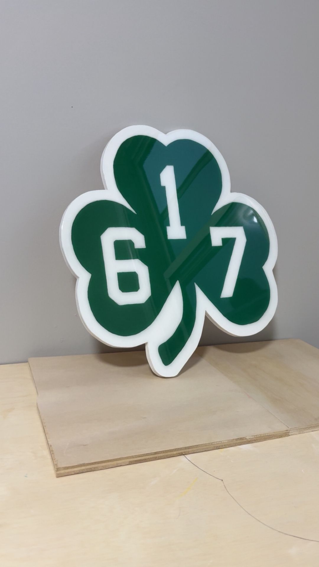 It’s a handcrafted custom-made “617 Shamrock” 18x18 wall art made of 1/2 finish plywood, acrylic paint and epoxy. Great for wall decorations or as a gift to family and friends. If you are interested or have any inquiries for something similar to this you’re more then welcome to reach out and message me for a custom made product.