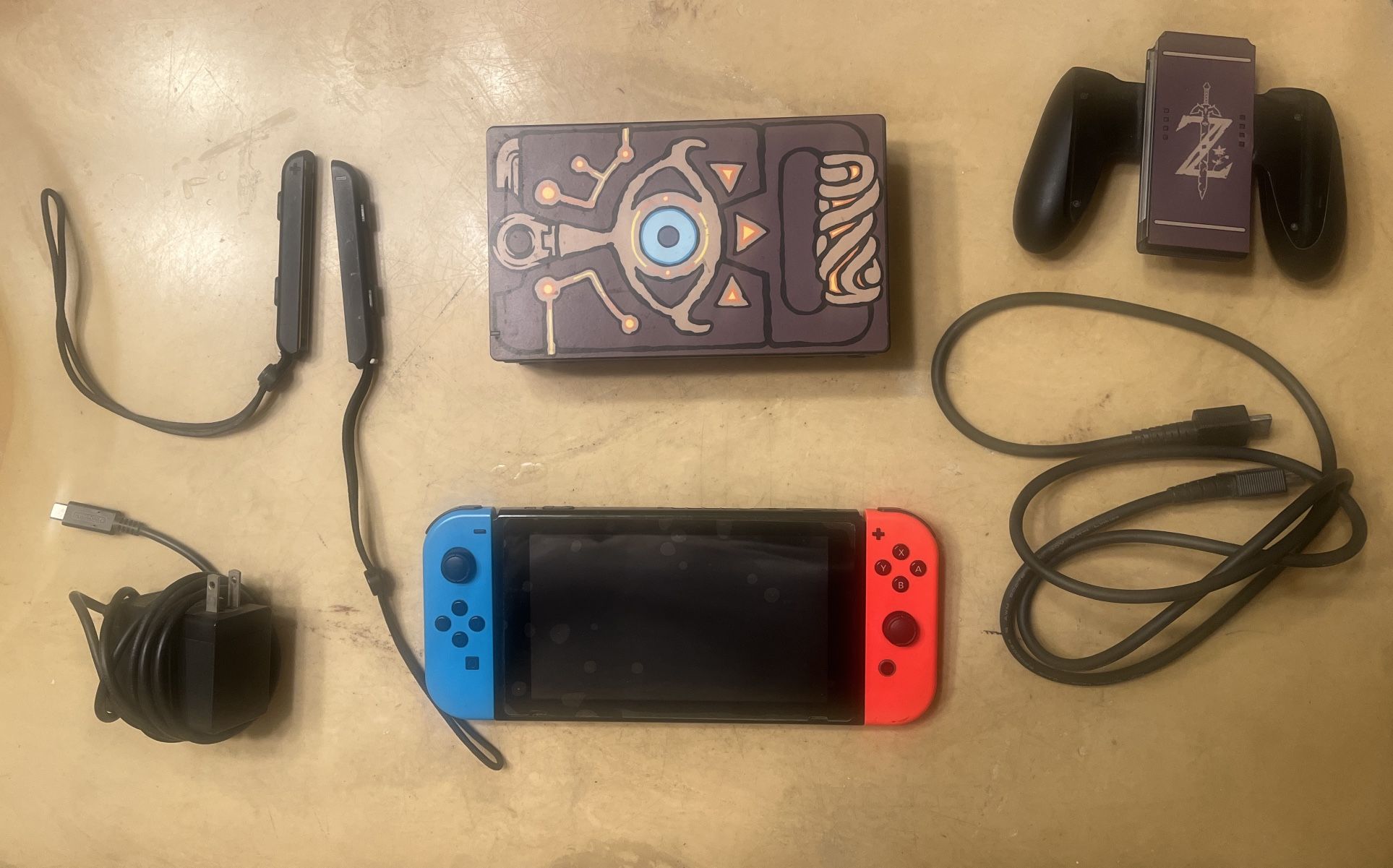 selling my nintendo switch with all of its accessories + super smash bros ultimate in its original box has a plastic screen protector with air bubbles + original screen has some scratches on it has original joycons but they occasionally drift, otherwise everything works perfectly fine