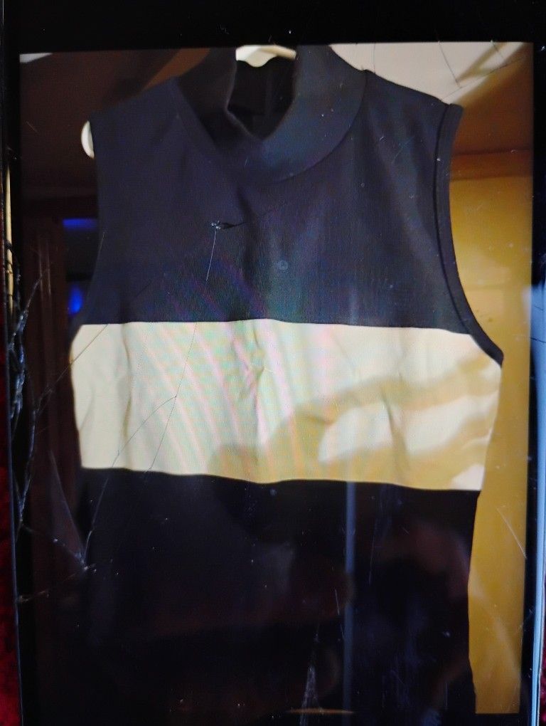 This is a very nice black woman top with one white stripe on the top. It's a small in size.