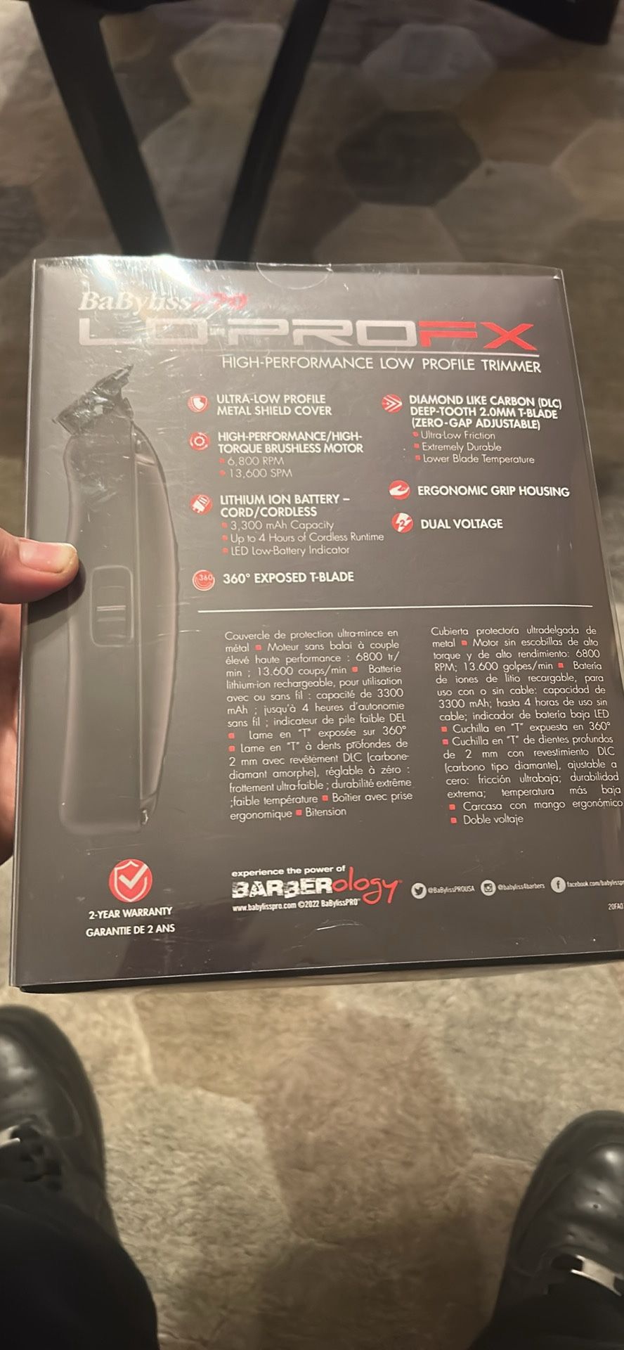 The Babyliss Pro LO-PRO FX FX726 Low Profile Cord/Cordless Lithium-Ion Trimmer is a high-quality grooming tool suitable for both men and women. With a sleek black design and lithium-ion battery power, this trimmer offers precision cutting with its T-blade head. It features a non-slip grip, low battery indicator, and dual voltage for versatility. Ideal for trimming chest, upper lip, nose, ear, back, pubic, neck, eyebrow, face, and body areas, this trimmer is a must-have for achieving a well-groomed look at home or on the go. Lmk if you want pictures