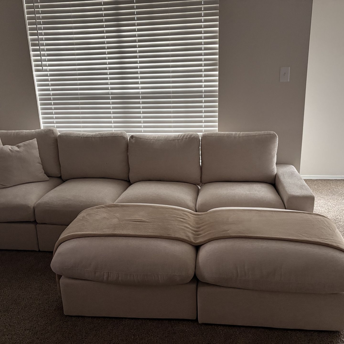 This couch is only a little over a month old. Brand new! With slight damages to the inner left corner of the couch but can easily be paired / covered with a decorative throw of your choice!