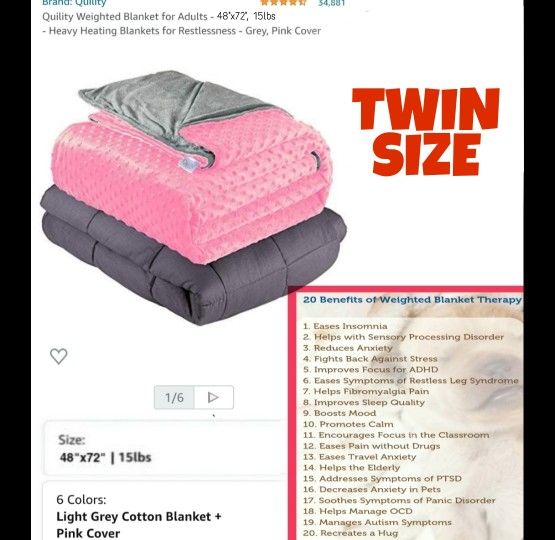 QUILITY WEIGHTED BLANKET (TWIN SIZE) NEW in its carrying bag. It must be pick up (77521). *Only interested people, please. * All items sold AS IS, no returns or exchanges. ⭕️ $50 dlls FIRM PRICE ✅ General characteristics: - Size: 48''x72'' | 15lbs - Brand: Quility - Color: Light Grey Cotton Blanket + Pink Cover - Fabric Type: 100% Cotton Blanket, 100% Polyester - - -Duvet Cover - PatternSolid Features & details: - 100% Cotton Blanket, 100% Polyester Duvet Cover Premium Weighted Blanket: Produced with the highest-quality, durable materials. The weighted blanket (15 pounds) helps aid relaxation and temperature control for better sleep. Ultra-breathable, soft duvet cover is removable and machine washable. - Expertly Balanced: These weighted throw blankets contain millions of premium micro glass beads that evenly distribute the pressure. This ensures that the weight is balanced for your comfort and tranquility. - A Better Night’s Sleep: The all-natural, durable 15 lb weighted blanket provides the warmth and comfort of a hug. The gentle pressure of the weighted microglass beads reduces tossing and turning while encouraging relaxation. - Helps Restlessness: Many experience sudden and unexpected bursts of energy and jitters. The queen size weighted blankets can help you sleep while enhancing feelings of relaxation, wakefulness and serenity.