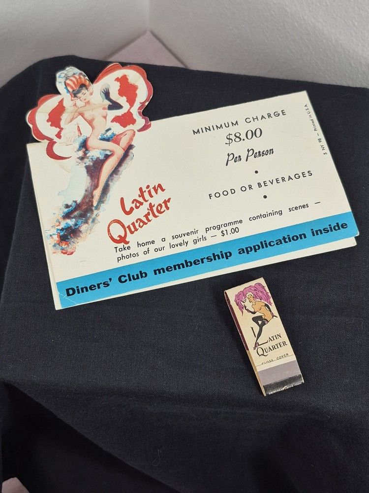 Vtg Latin Quarter Table Tent Diner's Club Advertising & Latin Qtr Slim Matchbook