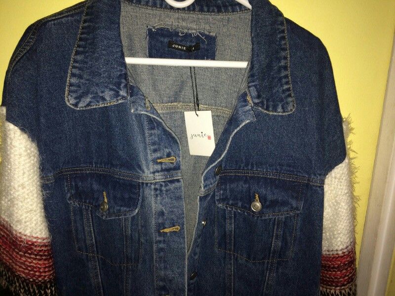 Junie Jacket Saks Fifth Avenue Size L/12 The arms are made of angora wool and the jacket is a dark blue denim.