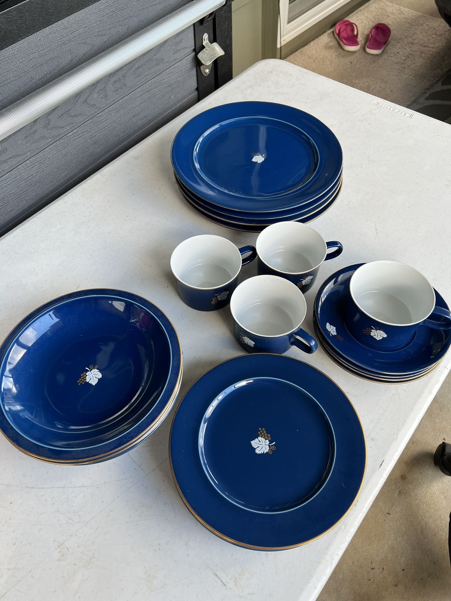 Produced in Japan from 1(contact info removed) this deep rich blue is set off by a single white leaf and gold trim These are in pretty good condition. Some light scratches on some of them but most are in really nice condition. No chips that we could see. Missing one salad plate but there are 4 dinner plates, 4 soup bowls, 3 salad plates, 4 cups with saucers. Cash or Venmo only.