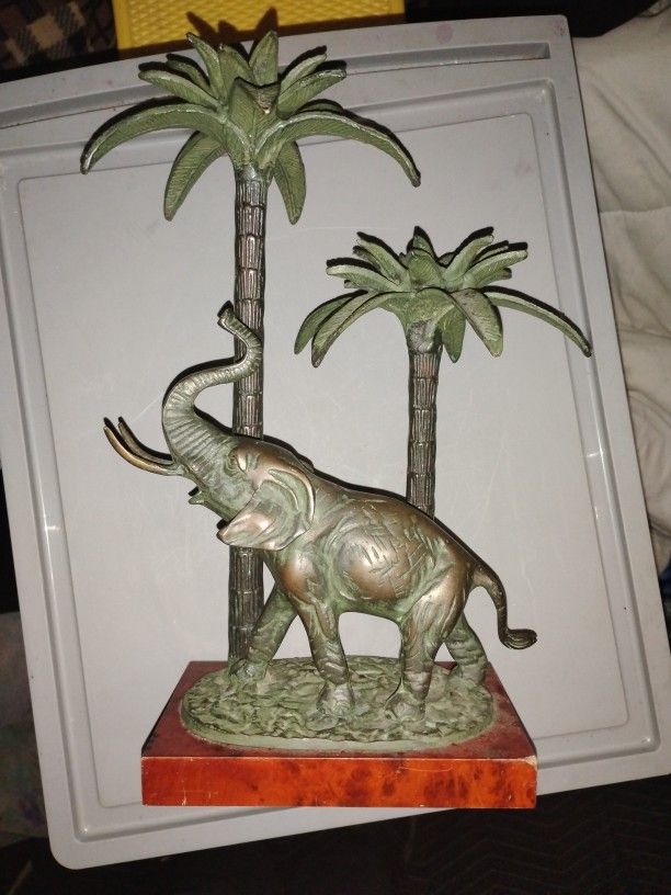Vtg Bronze Trunk Up Elephant Sculpture Palm Tree Candle Holder Marble Base 15.5”