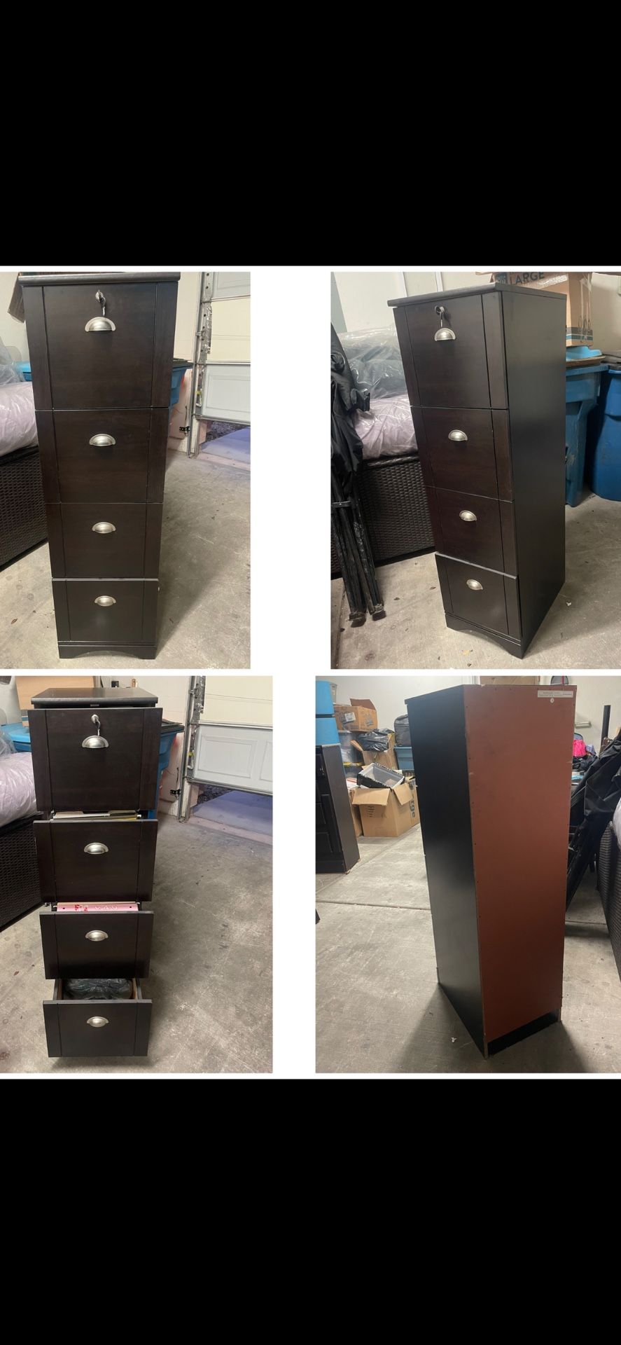 4 drawer Brown file cabinet Top drawer locks— comes with key. Slight wobble from moving so much and has a small chunk missing on the top— shown in photos. Light wear and tear. Comes with a few file dividers and folders. Stands about 4 1/2 ft tall. Pick up only Buffalo and warm springs.