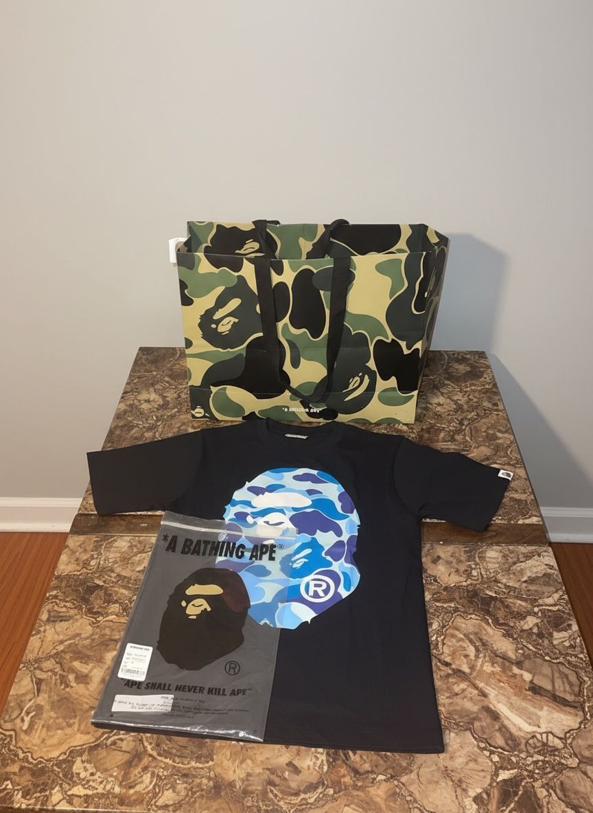 BAPE black graphic tee featuring the iconic blue camo Ape Head logo. Brand new and comes with original packaging and BAPE camo shopping bag. Message me if interested! Pick up only!