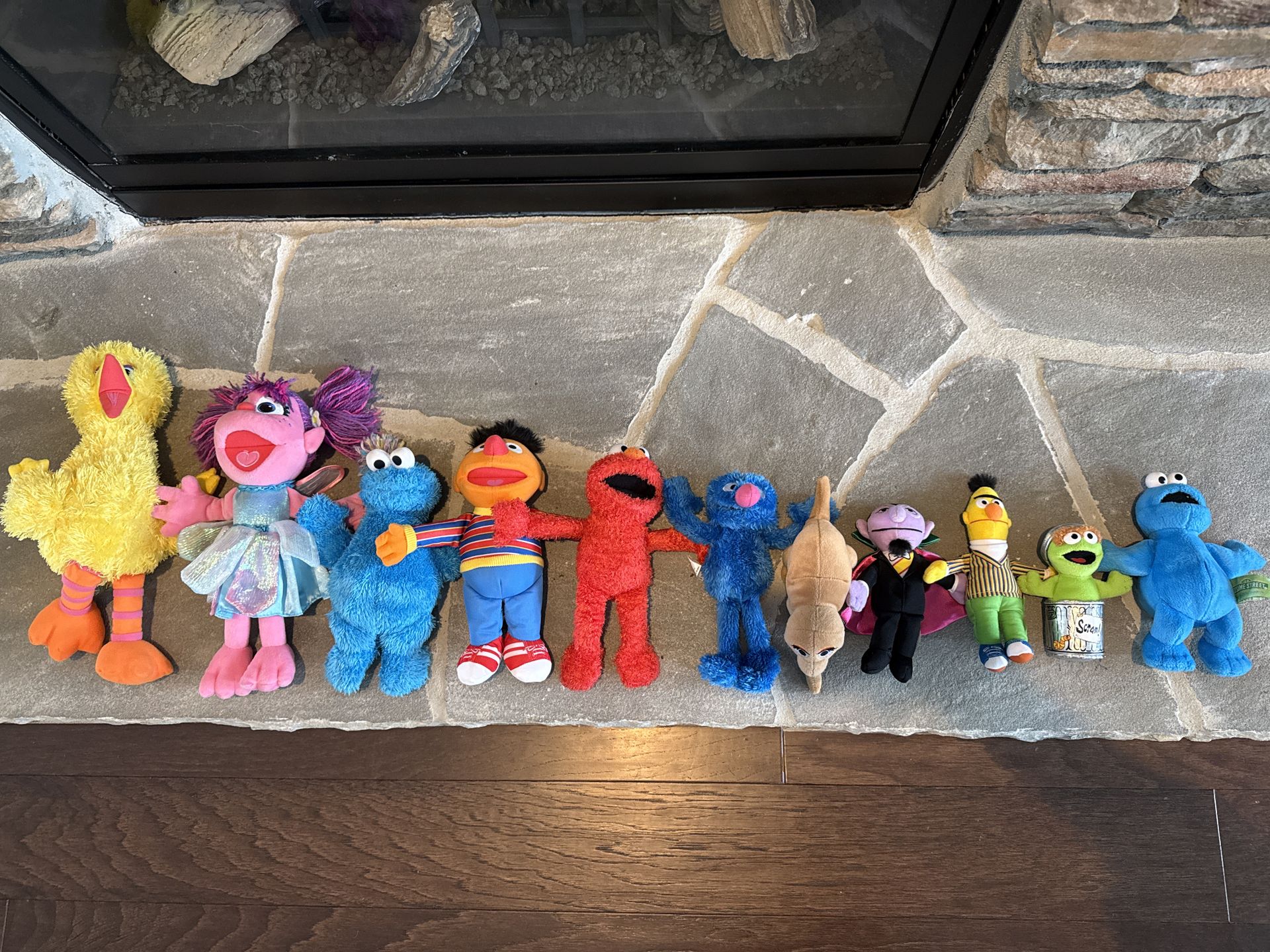 Set of Sesame Street character plush toys. Includes Big Bird, Abby Cadabby, Cookie Monster, Ernie, Elmo, Grover, Snufflupigus, Count, Bert, Oscar, magnetic hands Cookie Monster Each plushie is $5. Willing to separate.