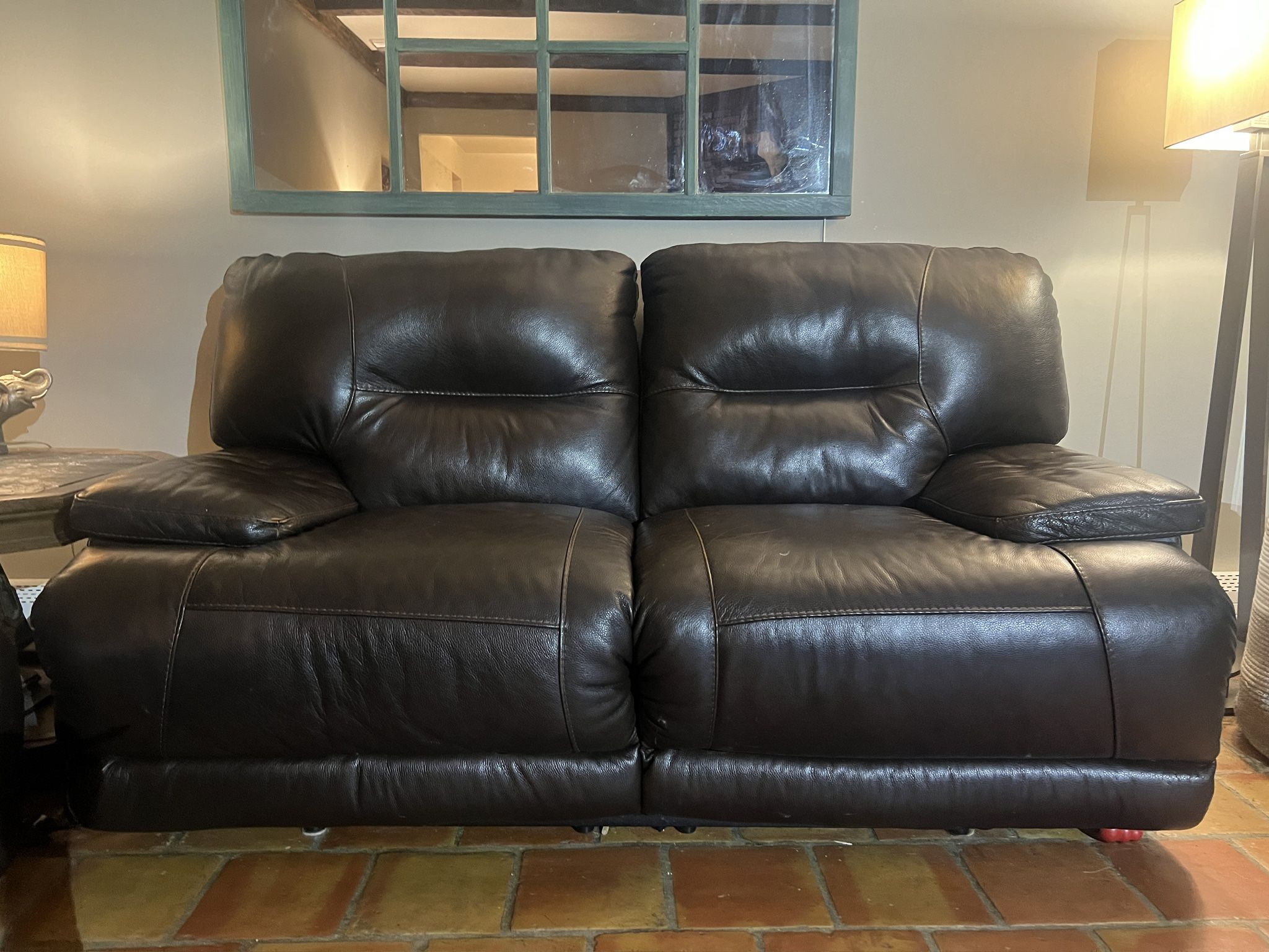 Chocolate brown luxurious leather sofa and matching loveseat. Upholstered in high-quality, supple leather, this set offers a timeless look that complements a wide range of décor styles. Each piece features smooth power recliners, allowing you to effortlessly adjust to your perfect lounging position at the touch of a button. Love Seat L- 69” W- 36” H- 39” Sofa L- 90” W- 36” H- 39” Plush, supportive cushioning and widely padded armrests provide exceptional comfort, while sturdy construction ensures long-lasting durability.