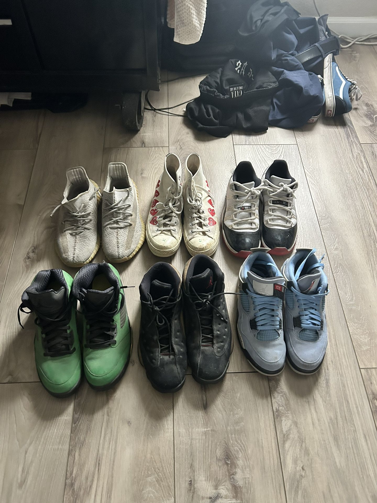 Yeezy SIZE 11 Comme de garçons SIZE 10 jordan 11 SIZE 10.5 Jordan 6 SIZE 10.5 Jordan 13 SIZE 11 Jordan 4 SIZE 10.5 Looking to get rid of all of them asap need the money if you have any other questions or concerns please feel free to message me have boxes for almost all shoes